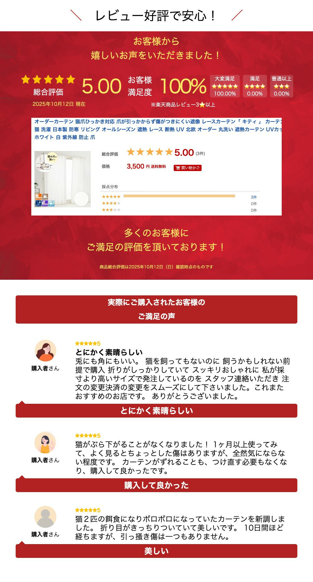 商品説明 織りの重なる部分を熱融着していて捲れにくく、ペットの爪が引っ掛かりにくい生地を使用した無地のレースカーテンです。 昼も夜も透けにくい生地を使用しているので、お部屋の大切なプライバシーを守ります。 猫と暮らしていると、カーテンを爪とぎや遊び道具と勘違いしてボロボロにしてしまうことがあります。 また、カーテンを伝って高所に登ってしまうこともあり、大変危険です。 爪が引っかからないカーテンを使用することでそういったいたずらを防ぐことができ、かわいいペットと快適に過ごせます。 商品情報 サイズ 幅:30〜400cm 丈:15cm〜270cm(フラットカーテン) 30cm〜270cm(1.5倍ヒダカーテン) ※1cm単位でオーダー可能 ※仕上がり幅はフック〜フック間、仕上がり丈はフック〜カーテン裾の長さとなります。総幅・総丈ではございません。 入数 1枚入り 色・柄 ホワイト(CT5212WH) 素材 ポリエステル100% 仕様 Aフック 特徴 遮熱・断熱、ネコツメ、夜も見えにくい、UVカット、洗濯OK(ウォッシャブル) 付属品 タッセル アジャスターフック(予備フック付き) 生産国 日本 透ける度合 お手入れ方法 商品発送の目安 6〜7営業日後の発送となります。 詳細は「配送について」をご確認ください。 ご注意 ・幅の大きなサイズについては、生地につなぎ目ができます。 <目安> 1.5倍ヒダカーテン:約101cm以上 フラットカーテン:約140cm以上 ・商品写真は実物の色に近づけておりますが、モニターの設定や使用場所の照明等の影響により、色の見え方が実物と異なる場合がございます。 事前にサンプル請求いただいてからのご注文をおすすめいたします。 複数お買い物する場合の購入方法 関連商品オーダーカーテン 夜も透けにくいプレーンで艶やかな防炎遮像レースカーテ...オーダーカーテン UVカット率約99% 遮熱 断熱 洗濯可能 形状記憶...オーダーカーテン ラメを全体に織り込んだ柔らかい手触りの防炎遮像レース...20,600円22,600円22,600円オーダーカーテン オーナメント文様をプリントした防炎遮像レースカーテン...カーテン オーダー 透けにくい レースカーテン ブライトベール カーテ...オーダーカーテン 夜も透けにくい細やかなチェック柄の入ったシンプルな防...22,600円20,600円20,600円オーダーカーテン つばめと星柄 刺繍 シルバー ゴールド 遮像レースカ...オーダーカーテン 花粉キャッチャー 花粉をキャッチするレースカーテン ...オーダーカーテン 透き通るような透明感が魅力のオーガンジーレースカーテ...20,600円20,600円20,600円関連ワード: カーテン 洗濯 日本製 防寒 リビング オールシーズン 遮熱 カーテン レース 断熱 UV カーテン 北欧 丸洗い カーテン オーダー 遮熱カーテン 紫外線 防止 ホワイト 白 カーテン 猫 UVカット カーテン 寝室 爪 猫 子供部屋 カーテン シンプル 遮熱 断熱 フラットカーテン おススメ 新生活 カーテン 紫外線 カット カバー 寒さ対策 カーテン 一人暮らし カーテン レースカーテン フラット フラットカーテン レース カーテン 保温 爪 猫 に 強い レース カーテン 寝室カーテン 傷がつきにくい商品の特徴 猫爪ひっかき対応レース バリエーション aiikaのオーダーカーテンについて詳しく見る1年保証について詳しく見る サイズ 幅:30〜400cm 丈:15cm〜270cm(フラットカーテン) 30cm〜270cm(1.5倍ヒダカーテン) ※1cm単位でオーダー可能 ※仕上がり幅はフック〜フック間、仕上がり丈はフック〜カーテン裾の長さとなります。総幅・総丈ではございません。 入数 1枚入 色・柄 ホワイト 素材 ポリエステル100% 仕様 Aフック 特徴 遮熱・断熱、ネコツメ、夜も見えにくい、UVカット、洗濯OK 付属品 タッセル、アジャスターフック(予備フック付き) 生産国 日本 透ける度合 お手入れ方法 商品発送の目安 6〜7営業日後の発送となります。詳細は「配送について」をご確認ください。 ご注意 幅の大きなサイズについては、生地につなぎ目ができます。 <目安> ・1.5倍ヒダカーテン:約101cm以上 ・フラットカーテン:約140cm以上 商品写真は実物の色に近づけておりますが、モニターの設定や使用場所の照明等の影響により、色の見え方が実物と異なる場合がございます。 事前にサンプル請求いただいてからのご注文をおすすめいたします。 【関連キーワード】 カーテン 洗濯 日本製 防寒 リビング オールシーズン 遮熱 カーテン レース 断熱 UV カーテン 北欧 丸洗い カーテン オーダー 遮熱カーテン 紫外線 防止 ホワイト 白 カーテン 猫 UVカット カーテン 寝室 爪 猫 子供部屋 カーテン シンプル 遮熱 断熱 フラットカーテン おススメ 新生活 カーテン 紫外線 カット カバー 寒さ対策 カーテン 一人暮らし カーテン レースカーテン フラット フラットカーテン レース カーテン 保温 爪 猫 に 強い レース カーテン 寝室カーテン 傷がつきにくい