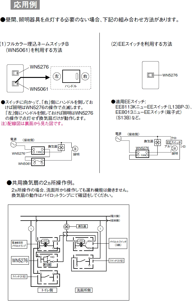 パナソニック WN5276 埋込トイレ換気スイッチ(換気扇消し遅れ3分) ・スイッチONで照明と換気扇がONします。 ・スイッチOFFで照明はすぐにOFF、換気扇は約3分後に自動OFFします。 ・換気扇の消し忘れがなくなり電気の節約になります。 ・電子式ではないため、スイッチON時にギア音がします。 ・またギア巻きの際、一瞬重く感じますが構造上故障ではないです。