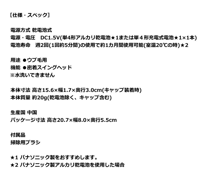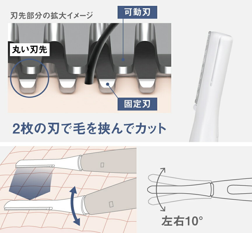 パナソニック(Panasonic) フェリエ ES-WF53-E “ベージュ” ■商品説明 丸い刃先で肌にやさしい、約0.12 mmのうす刃。 水なしですっきり剃れる 刃先部分の拡大イメージ:2枚の刃で毛を挟んでカット 丸い刃先で肌にやさしい 毛を切る刃が肌にふれない安心設計 細かいウブ毛も根元から一気にカット 切れ味長持ちステンレス刃 快適な使い心地を追求した本体設計 イメージ:密着スイングヘッド(左右10°) 肌の凹凸に合わせて動く、密着スイングヘッド ヘッドが肌にそって動き、やさしく密着。凹凸部分も剃り残しなく グリップしやすい本体形状
