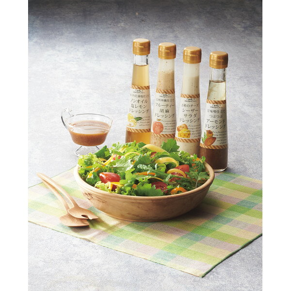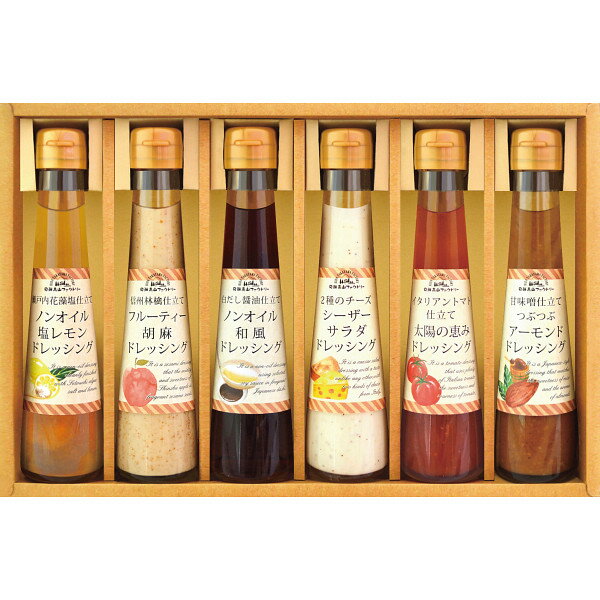 ●商品内容:瀬戸内花藻塩仕立てノンオイル塩レモンドレッシング120ml×1本、信州林檎仕立てフルーティー胡麻ドレッシング120ml×1本、白だし醤油仕立てノンオイル和風ドレッシング120ml×1本、2種のイタリアンチーズシーザーサラダドレッシング120ml×1本、イタリアントマト仕立て太陽の恵みドレッシング120ml×1本、甘味噌仕立てつぶつぶアーモンドドレッシング120ml×1本●賞味期間:製造から180日●アレルギー:卵・乳成分・小麦・大豆・りんご・ごま●箱サイズ:約34×22.5×5.5cm●箱重量:約2055g●化粧箱入 ひとつひとつ丁寧に造り上げたオリジナルドレッシング。それぞれ個性豊かな特長があり、サラダ以外にもさまざまなお料理で活躍します。普段のドレッシングとは一味も二味も違う革新的なドレッシングが誕生しました。 ※北海道・沖縄・離島など一部お届けできない地域、また別料金を頂く地域もございます。 あらゆるギフトシーンにどうぞ 内祝い お返し 出産 出産内祝い 結婚 結婚内祝い 御礼 快気祝い 快気内祝い 御見舞御礼 全快祝い お祝い 結婚式 引き出物 結婚祝い 結婚内祝い 引越しご挨拶 父の日 母の日 敬老の日 入学内祝い 入園内祝い 成人式 初節句 新築内祝い 粗品 記念品 二次会 景品 周年記念 コンペ景品 プレゼント 誕生日 お中元 残暑見舞い お歳暮 御年賀 贈答品 総合通販 一周忌 三回忌 法事引出物 香典返し 初盆 志 回忌法要 還暦御祝い 開店お祝い 退職 卒業記念品 お餞別 心ばかり 大量注文可 内祝 御返し 出産内祝 結婚内祝 お礼 快気祝 快気内祝 全快祝 御祝い 御祝 結婚式 引出物 結婚祝 御結婚お祝い 御結婚御祝 結婚御祝 結婚内祝 引越挨拶 引越御挨拶 挨拶 御挨拶 ごあいさつ ご挨拶 入学内祝 入園内祝 新築内祝 周年記念 ギフト 誕生日 中元 御中元 残暑見舞 残暑御見舞 歳暮 年賀 お年賀 法事 法要 法事引き出物 香典 還暦祝 還暦御祝 還暦お祝い 開店祝 開店御祝 開店御祝い 開店祝い 出産祝い 餞別 メッセージカード無料