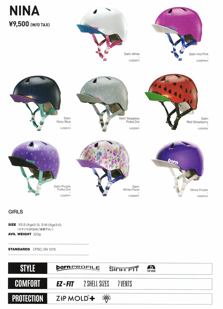 キッズ向けガールズヘルメット (推奨年齢2-6歳) 安全で快適、カワイイがキーワードの女の子モデルNINA(ニーナ)。女の子が大好きなポップなカラーリングとデザインで仕上げました。bern独自のテクノロジーZIP MOLD +を搭載し、高い耐衝撃性と軽量で快適な使用感を実現しました。 汗をかきやすい頭回り部分のバイザー付インナーは取り外して洗濯することで、ヘルメット本体も清潔に保つことが可能です。またインナー後頭部にはベルクロによる簡単なサイズ調整が可能なEZ-FITインナーシステムを採用。日々大きくなる頭のサイズに合わせて簡単にフィッティングの調整が可能です。送り迎えの自転車から、バランスバイクなどのアクティブシーンまでサポートします。 バイザーが一体になったALL SEASONライナーを搭載した商品にウインターライナーを装着する際は、ライナーごと交換する必要があるため、装着時にはバイザーなしの状態となります。 推奨年齢は目安となります。お子様の頭回りを計測の上、サイズ表の推奨頭回り寸法に適合しているかをご確認いただくことをおすすめします。 メーカー保証付き、安心の日本正規メーカー(代理店)商品、さらに送料無料です。 注)沖縄、離島など一部地域は別途中継料が必要となります。 画像には該当商品以外が掲載されている場合がございます。またメーカー事情で仕様変更になる場合がございます。 ご注文前に実店舗やメーカー在庫、予約商品が完売の場合はご容赦ください。商品確保ができない場合はすぐにご連絡をさせていただきます。発売日や配送日が前後する場合があります。 欧米人の頭の形状をベースに設計されていますので横幅がせまく実寸より1〜2サイズ大きいサイズで適合する場合が多いようです(ただし頭の形状によります)。初めてのご購入時はご注意ください。在庫があればサイズ交換可能です(未使用、お受取り後1週間以内、また送料のご負担をお願いします)。一部アイテムはメーカー在庫のため、予約完売、売り違いの場合はご了承ください。商品確保ができない場合はすぐにご連絡をさせていただきます。よろしければレビューを記載いただけると幸いです。お買求めの商品ページより記載できます。
