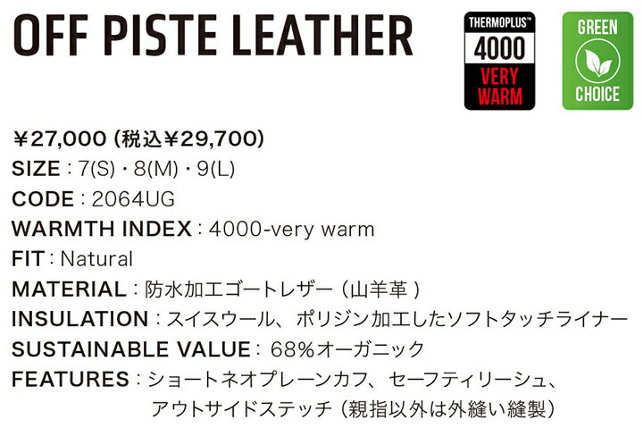 エキスパートのために開発されたOFF PISTE。スイスウールを使用し最高の温かさを提供するハイスペックグローブ。 防水加工ゴートレザー(山羊革) メーカー保証付き、安心の日本正規代理店商品、さらに送料無料です。 注)沖縄、離島など一部地域は別途中継料が必要となります。 画像には該当商品以外が掲載されている場合がございます。またメーカー事情で仕様変更になる場合がございます。 ご注文前に実店舗やメーカー在庫、予約商品が完売の場合はご容赦ください。商品確保ができない場合はすぐにご連絡をさせていただきます。発売日や配送日が前後する場合があります。