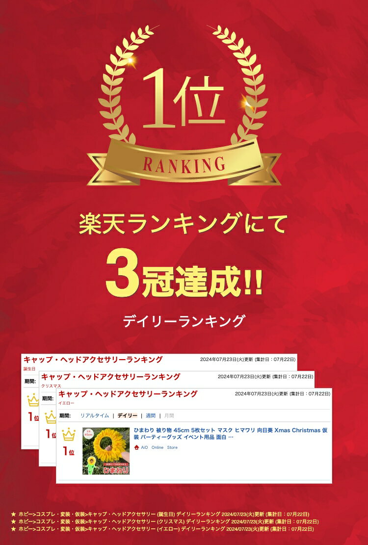 ひまわり 被り物 45cm 5枚 マスク ヒマワリ 向日葵 Xmas Christmas 仮装 パーティーグッズ イベント用品 面白 変装 誕生日 室内 置物 クリスマス用品 可愛い 渋い かわいい 華やか おしゃれ パーティー デコレーション グッズ 雑貨 北欧 アメリカ バースデー プレゼント SNS 撮影用 舞台 演劇 劇 劇場 ミュージカル ハロウィーン お面 仮装パーティー コスチューム 発表会 演技 演者 衣装 宴会の達人 おもしろ 面白い ギャグ 盛り上げグッズ 文化祭 忘年会 サイズ 直径約45cm×厚さ約8mm 重量 約45g 素材 ナイロン布 【内容品】 5枚セット ※測定許容誤差は±3cmです ※ゴム紐ですので簡単に装着可能です クリスマス、ハロウィン、仮装大会など、とにかく目立ちたい方にオススメの「ひまわり」の被り物になります。 宴会・余興・パーティーなど、各種イベントにお使いいただけます。 みんなで被ればパーティー会場は「ひまわり畑」に大変身。参加者全員が笑顔になれる…そんなオモシロひまわりの被り物です。 忘年会、新年会などの余興に。宴会や二次会、パーティーなどのかぶりものとしてオススメです。また、卒業記念や誕生日などの思い出づくりにも! 宴会要員。それはどのグループにもきっと一人はいる芸達者な人気者!定番宴会から、度肝を抜くマニアックな宴会まで大活躍。ひまわりに被り物は、手軽な仮装でウケを狙える便利なアイテムです! フェスやパーティにピッタリ! POPでキュートなひまわりはSNS映えもばっちり! まるで本物のひまわりのようなデザインの被り物はかなりインパクト大。これを被って登場すれば、イベントやパーティーで人気者になれるはずです!他のパーティーグッズなどと組み合わせて盛り上がりましょう! 実際に被るだけなので1秒で変身することができます。ひまわりにあわせたコスプレをすればさらに宴会感も増しますし、普段着やスーツに被ると上と下のギャップがおもしろいという利点もあります。インパクト大なコミカルデザインが周りの視線を一瞬でさらいます。被るだけで手軽にコスプレが楽しめるのも魅力ですね クリスマス会や職場の宴会やパーティーなどの余興用に準備したい人におすすめです パーティーシーズン用に1つあると、皆で使えて重宝するでしょう。かわいいひまわりで会場の注目を集めたい人は、ぜひチェックしてみてください ●PCモニターの色彩具合などにより、色の見え方に違いがある場合がございます。 ●色違い、商品違い、大きな欠陥の場合は、到着後3日以内に連絡下さい 。 ●生産時期によってデザインが若干異なる場合がございます。予めご了承ください。 ●色やサイズがお気に召さないなどの交換、イメージと違った等による返品は未開封の商品でもお受け出来ません 内祝 内祝い 結婚 出産 香典 快気 結婚内祝い 出産内祝い 香典返し 誕生日 引出物 結婚引出物 結婚引き出物 ウェディングギフト ブライダルギフト 二次会 披露宴 結婚祝い 出産祝い 初節句 七五三 お礼 バレンタイン ホワイトデー 新生活 母の日 父の日 遅れてごめんね 敬老の日 クリスマス 新年 ゴルフコンペ コンペ 出産祝い 夏ギフト 友人 友達 家族 両親 同僚 先輩 後輩 ギフトショップ 入学 入学式 入園 入園式 卒園 卒業 お返し プレゼント 贈り物 誕生祝い 結婚記念 引っ越し祝い 引っ越し内祝い 開店祝い入学祝い 就職祝い 卒業祝い 新築祝い 初節句祝い 節句祝い ギフトセット セット 法人向け 法人 ギフト 大量注文 還暦祝い 長寿祝い 年賀状 お正月 成人式 オシャレ かわいい かっこいい 愛妻の日 バレンタインデー 本命 結婚記念日 女性 恋人 ひな祭り 男性 女性に人気 ひなまつり 記念日 歓送迎会 七夕 ハロウィン パーティー イベント 贈物 いい夫婦の日 サプライズ 母 義母 父 義父 お父さん お母さん 祖母 祖父 おじいちゃん おばあちゃん 子供 息子 娘 兄 姉 妹 弟 彼女 彼氏 部下 社長 0歳 1歳 10代 20代 30代 40代 50代 60代 70代 80代 90代 1月 2月 3月 4月 5月 6月 7月 8月 9月 10月 11月 12月関連商品【在庫限り】【人気商品】 トイレブラシ マスカット グリーン さくらん...【人気商品】マスク パンダ 被り物 かぶりもの 帽子 動物 アニマル ...3,180円3,480円【楽天1位3冠達成】ひまわり 被り物 45cm 1枚 マスク ヒマワリ...【楽天1位10冠達成】帽子 ハッピーバースデー ハット ピンク ケーキ...2,180円3,280円【人気商品】 クッション かわいいウサギのミニソファ ホワイト 特大 ...【楽天1位50冠達成】帽子 ハッピー バースデー ホワイト ハット ケ...7,980円2,680円【人気商品】【ランキング1位獲得】 マスク 恐竜 ティラノサウルス 被...ヘアアクセサリー 桜の花 ピンクの髪飾り 【5点セット】 髪飾り ヘア...4,980円3,980円帽子 中華 中国の宮殿帽子 後ろ髪付き カンフースタイル 大人用 全2...【予約商品】コスプレ 王様の冠 ヘッドバンド ゴールドカラー 金の冠 ...1,980円1,980円多彩な贈り物シーンに対応したギフト 内祝い お祝い返し ウェディングギフト ブライダルギフト 引き出物 結婚内祝い 出産内祝い 入園