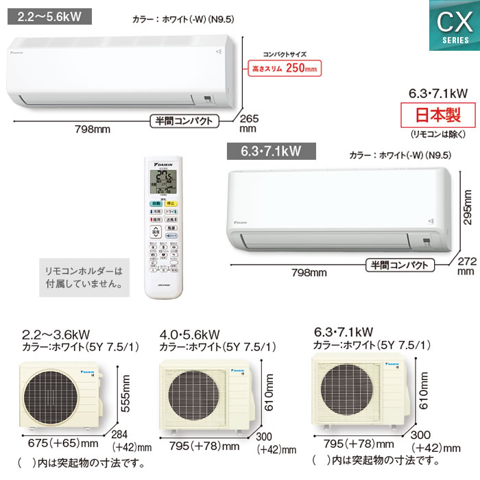 >>取付工事について >>工事料金シミュレーション 商品仕様 セット型番 S715ATCV-W 室内機型番 F715ATCV-W 室外機型番 R715ACV 電源 単相200V20A 電源タイプ 室外電源タイプ(直結) 冷媒配管接続径 液側φ6.4/ガス側φ12.7(2分4分) 機能 基本運転 スイングコンプレッサー PIT制御 低外気タフネス暖房 高外気タフネス冷房 しつど制御 9段階セレクトドライ 自動運転 自動運転 気流制御 風ないス運転(天井気流) ロング気流(10m:6.3・7.1kW以上) オートスイング(上下・左右・立体) 保湿・清潔 水内部クリーン(結露水洗浄) クリアコート熱交換器 ストリーマ内部クリーン ストリーマ空気清浄 抗ウイルスフィルター(集塵フィルター)※3年間交換不要タイプ フィルター自動お掃除 快適温度制御 ヒートブースト制御 生活便利 室温パトロール おやすみ運転 タイマー機能 ワンタッチ切タイマー ワンタッチ入タイマー その他の機能 HA対応 HAJEM-A規格対応 スマホ接続対応(内蔵) 製品についてのお問い合わせは・・・ダイキンコンタクトセンター フリーダイヤル 0120-881-081 ご注文前に、メーカーサイトやカタログ等で寸法・機能等を必ずご確認ください。 ※商品のみのお買い上げの場合、メーカー付属品以外の配管・配線類は一切付属しておりません。