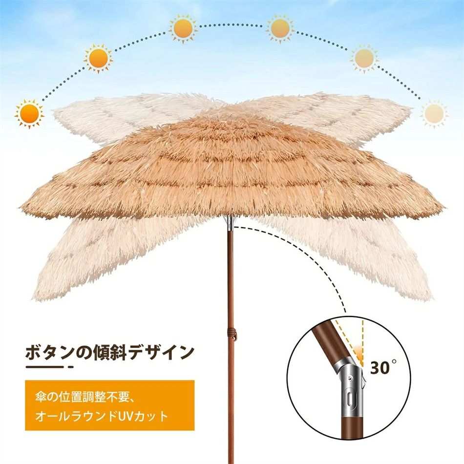 【頑丈で耐久性抜群のフレーム】 高強度鋼管ポール + 8本のガラス繊維リブで安定性を確保。 直径 約3.5cm(1.38インチ) の太めポールで、強風時もしっかり固定。 高さ調整可能で、標準的なパティオテーブルやパラソルスタンドに適合。 【チルト機能 & 簡単開閉】 傾斜(チルト)調整可能で、太陽の動きに合わせて日陰を最適化。 プッシュボタン式で、ワンタッチで開閉でき、取り扱いが楽。 【UVカット99%・SPF50+】 高密度人工わら素材(ポリエステル/ナイロン+PP)で、紫外線を 99%以上カット。 防水・防炎・防虫・防カビ 加工で、長期間美しい見た目を維持。 【幅広いシーンで活躍】 ビーチ、庭、テラス、プールサイド、バーベキュー、カフェ など、アウトドアシーンに最適。 トロピカルなデザインで、リゾート気分を演出。 【商品仕様】 素材(キャノピー):人工わら調ナイロン+PPカバー フレーム:鋼製ポール + ガラス繊維リブ 特徴:軽量・折りたたみ可能・持ち運び便利 【ご注意】 ベース(土台)は別売りです。強風時はしっかり固定してください。 チルト機構が固い場合は、ネジの調整を行ってください。 商品詳細: 種類: ハワイアン イミテーション・ストロー・パラソル 主な用途: ビーチ、庭、テラス、ラウンジなどでの日よけ。 素材 (キャノピー): 高品質な人工わら調素材(主にポリエステル/ナイロン+PP)。