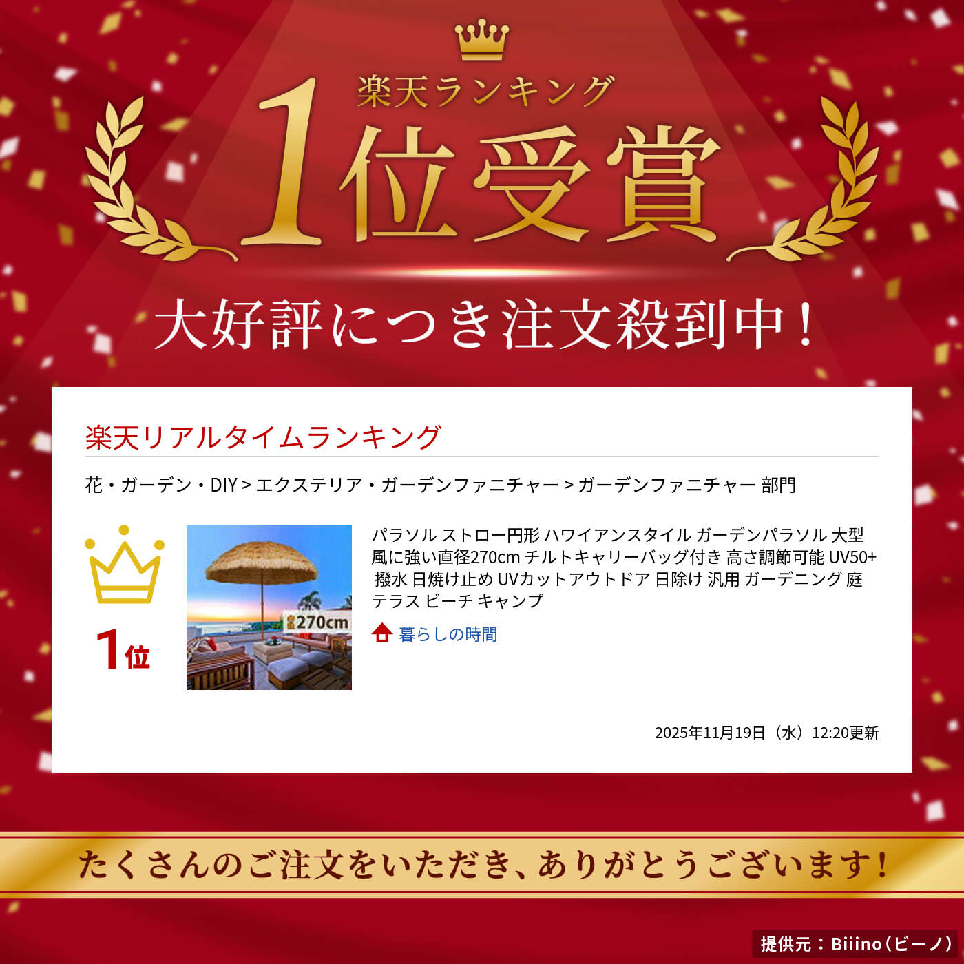 パラソル ストロー円形 ハワイアンスタイル ガーデンパラソル 大型 風に強い直径270cm チルトキャリーバッグ付き 高さ調節可能 UV50+ 撥水 日焼け止め UVカットアウトドア 日除け 汎用 ガーデニング 庭 テラス ビーチ キャンプ