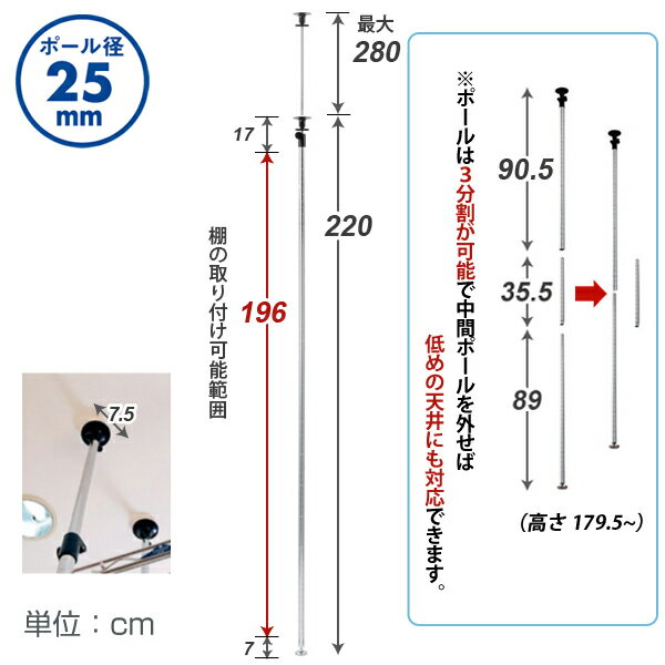 ※最短希望の場合はご注文備考欄に「最短希望」とご明記の上ご注文ください。商品仕様 商品名 [25mm] ルミナス 突っ張りポール 耐震 転倒防止 2本セット 25P-2228 型番 25P-2228 JANコード 4536863054875 ポール径 25mm 重量(約) 5.64kg サイズ 商品サイズ(約):長さ220〜280cm 内容明細 上部突っ張りポール(約85.5cm)×2本、中間ポール(約35.5cm)×2本、下部ポール(約89cm)×2本、円形アジャスター×2個 材質 スチール(クロームメッキ)※クリアコーティング(防サビ加工)、ポリプロピレン、ABS樹脂 特徴 つっぱり部をスライドさせて、ラックを天井に突っ張ることができます。このポールは3本のポールを連結して1本のポールになっています。本来は高さ約220から281cmの仕様になっていますが、中間ポール(約35.5cm)を取り付けなければ、天井の高さ約183cmから243cmにも対応します。※1台のラックに2本使用する場合は、ラックを設置する壁面側に2本取り付けてください。 メーカー ◇Luminousは、株式会社ドウシシャの商標です。 使用上のご注意 当店で取り扱っております 「ドウシシャ製 ルミナススチールラックシリーズ」 につきましては 他メーカーのラック(メタル製ラック ・メタルシェルフ等)には互換性はございません。 特にお手持ちのラックからの追加購入やパーツ付け足しの際には各メーカーご確認の上ご購入下さい。 主な他メーカーのスチールラック 例)アイリスオーヤマ/エレクター/YAMAZEN 山善・ヤマゼン/ニトリ など