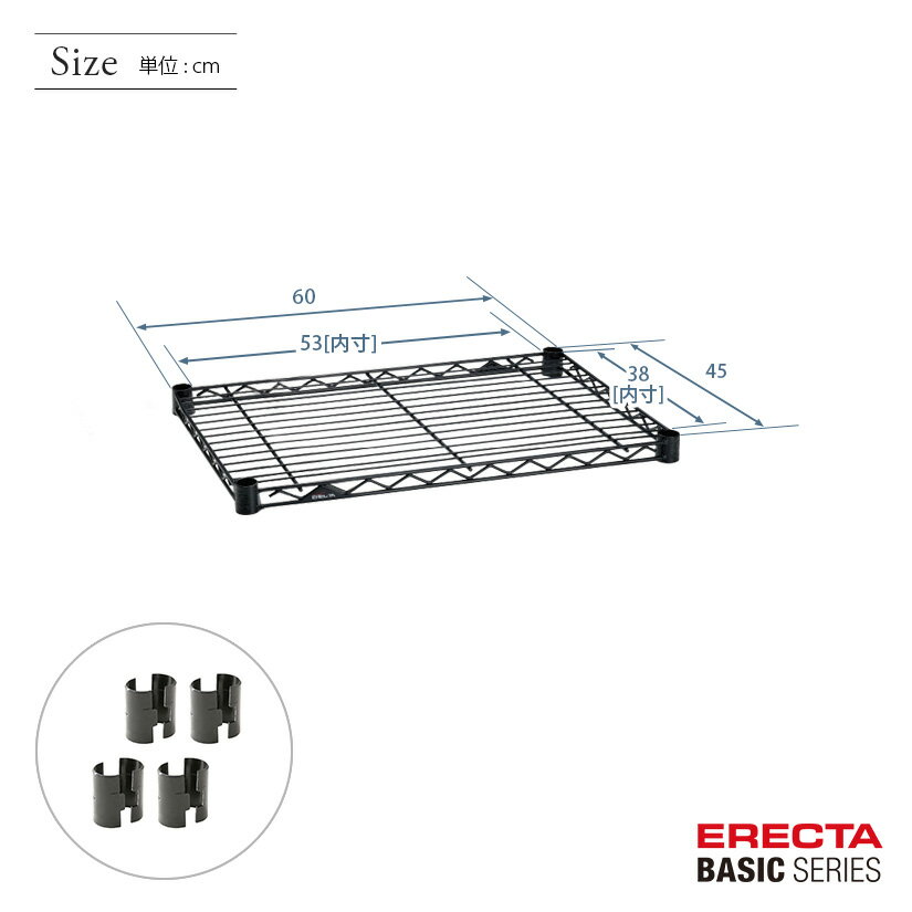 商品仕様 商品シリーズ ベーシックシリーズ ワイヤーシェルフ ブラック 幅60×奥行45cm B1824B1 パーツ 外形寸法 幅60×奥行45cm シェルフ内寸(約) 幅53×奥行38cm 耐荷重 135/棚1段 ※垂直荷重(等分布) 内容明細 ワイヤーシェルフ1枚、テーパードスリーブ4組 材質 棚板:スチール(エポキシコーティング仕上げ)、テーパードスリーブ4組(ABS樹脂・ブラック) 備考 モデルチェンジ前のホームエレクターはベーシックシリーズと同じモジュールで構成されており、互換性があります。ホームエレクターご使用の方で、追加購入をご希望の方は同サイズをお求めください。 ※掲載画像のコーナリングの刻印、プレートはモデルチェンジ前のデザインになります。ベーシックシリーズはデザインが変更されております為、予めご了承くださいませ。 型番 B1824B1 JANコード 4933315135227 メーカー エレクター株式会社