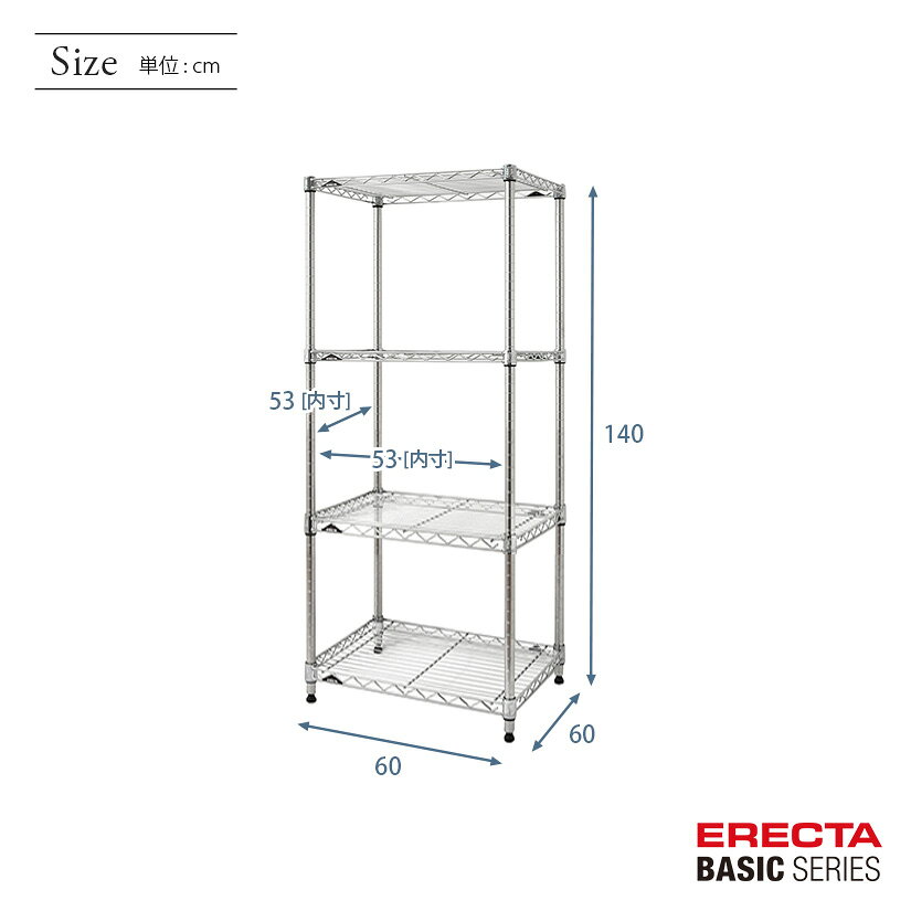 ★P10倍!★ スチールラック エレクター ERECTA ラック ベーシックシリーズ フリーラック 棚 収納棚 業務用 プロ仕様 収納 アルミラック カラーラック クローム 幅60×奥行60×高さ140cm 4段 RBR2424544C