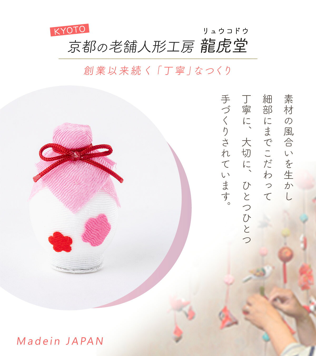 ◆雛人形 小道具 ひな人形 ちりめん【ちりめん細工 白酒】ひな人形用小道具セット お雛様 京都老舗 龍虎堂 リュウコドウ◆品番:40-849使用時期:ひな祭り 雛祭り 初節句 節句飾り用途:飾り物 オブジェ 人形 和雑貨素材:レーヨンちりめん生産国:日本付属:白酒サイズ(cm):全体-幅3.5×奥行3.5×高さ5cm(Pケースのサイズ)商品特徴:厄を除け、運気を上げる白酒。お雛様と一緒にお飾り下さい。※商品は手作りのため、お着物の柄やお色、お人形の表情が画像と異なる場合がございます。※その他、仔細についても個体差がありますことご了承くださいませ。※姉妹店と在庫を共有しております都合上、まれに在庫切れでもご注文できてしまう場合がございます。その際は至急ご連絡をいたします。女の子が産まれての「初節句」は、嫁方の親が「子供の身代わりとなって災いが降りかからないように」という思いを込めた雛人形を贈ります。古の習わしと現代の雛祭りを融合し、お子さまのお部屋にお飾りいただく、季節を演出するインテリア、お店などのディスプレイや恋人への沢山の思いを込めたプレゼントなど、多くのシーンで大活躍します。京都の雛人形工房の老舗 リュウコドウ(龍虎堂)の手作り小道具 ◆雛人形 ひな人形 小道具 ひな人形 ちりめん 2025年【ちりめん細工 白酒】ひな人形用小道具セット お雛様 京都老舗 龍虎堂 リュウコドウ◆お手持ちのお人形に小道具を合わせてオリジナルの商品にしてみませんか。お雛様、端午の節句、お正月などの季節のものにピッタリです。お人形飾りをより一層引き立ててくれます。