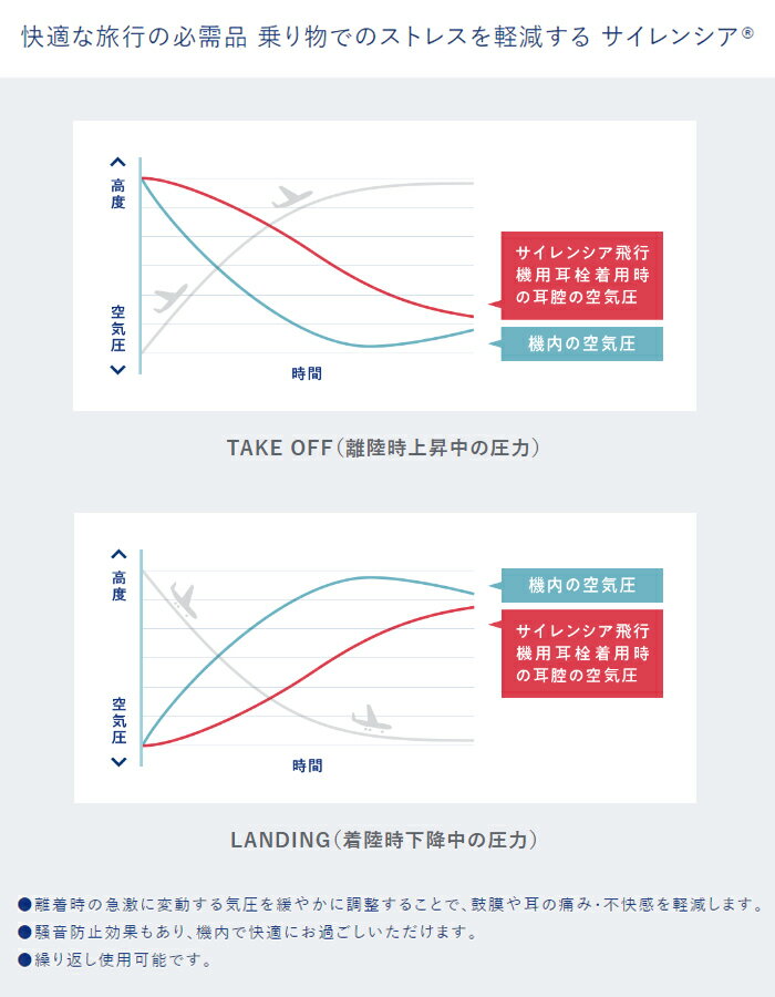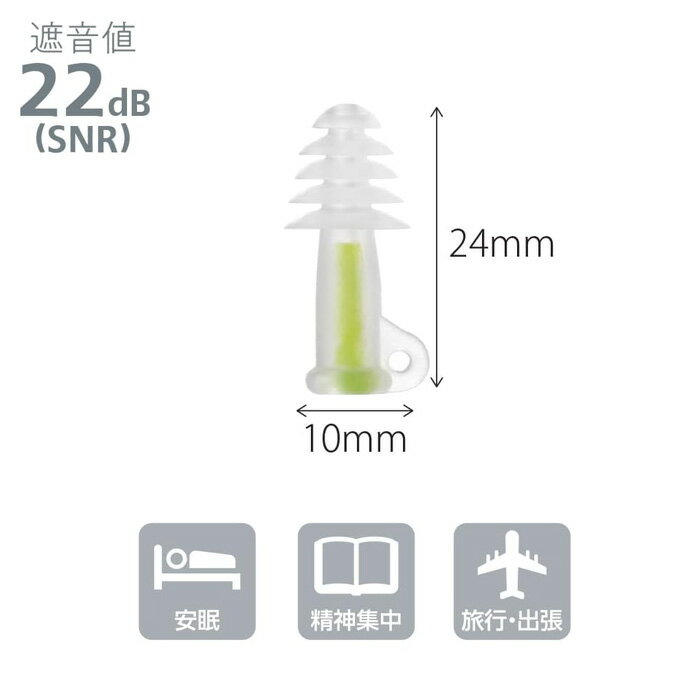 飛行機用 耳栓 サイレンシア フライト エアー コード付き Sサイズ(子供・女性向き) 気圧の変動による民の不快感を軽減する耳栓「サイレンシア フライト エアー」Sサイズ。女性や耳孔の小さな人向けサイズです。 機能はレギュラーサイズそのままに、女性やお子様など耳孔の小さな方のために設計されたスモールサイズの飛行機用耳せん。 内部に気圧変化を緩やかにする調整機能がついていることで、飛行機内での気圧変動によって起こる鼓膜や耳の痛み・不快感を軽減します。 装着部が5段フランジ構造になっており、しっかり耳にフィット。遮音効果による安静も得られ、飛行機旅行での体調維持に最適です。 飛行機内での使用時はもちろん、手荷物バッグの中でも耳栓を紛失しない便利なコード付きです。 好みの位置でストラップがきく調節パーツ付きで、コードの長さは簡単に変えられます。 コードの長さは最大で約65cmです。 ■サイズ:全長24mm×直径10mm ■遮音値:22dB ■ペア数:1ペア ■耳せん材質:エラストマー/低密度ポリエチレン ※2023年11月当店お取扱い分より仕様が変更となりました。 コード付きになり、遮音値は22dBとなっております。 ⇒「サイレンシア フライト エアー レギュラーサイズ」はコチラ ⇒耳栓一覧はコチラ飛行機用 耳栓 サイレンシア フライト エアー コード付き Sサイズ 1組入り ケース付き