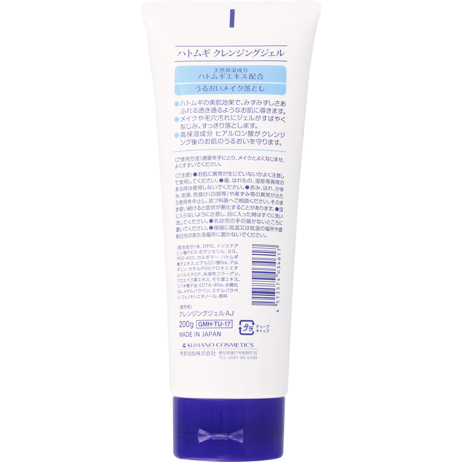 【3個セット】ハトムギ クレンジングジェル 200g【熊野油脂】無着色・鉱物油フリー・アルコールフリー天然保湿成分ハトムギエキス配合、高保湿成分ヒアルロン酸配合