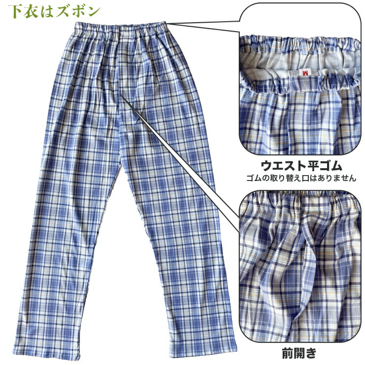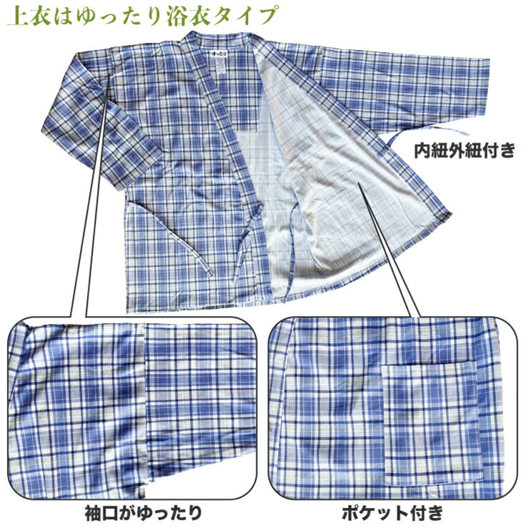 上衣が紐留め打合せタイプ、下が一般的なズボンタイプの入院、介護向け紳士パジャマです。 ☆(ネルや起毛生地ではありませんが)綿ニットスムース編みの程よい着心地。 ☆上衣は浴衣のように内紐外紐で打合せなのでゆったりご着用いただけます。 ☆袖付けがゆったりとした作りで着脱もスムーズです。 ☆ズボン(パンツ)は一般的なパジャマの下です。 ☆肌にやさしい質感。(日本製) ※別ページで寝巻タイプの綿ニット(スムース編み)も販売しております。 ※ギフト包装の取り扱いはございませんのでご了承ください。 ※サイズ・カラーはお選びいただけますが柄は一定ではなく当店のおまかせでご了承下さい。 製品情報 サイズ MとL(寸法は画像でご確認ください。) 色・柄 ブルー系とグレー系 ※柄は一定ではなく当店のおまかせでご了承下さい。 素材 綿100% 生産国 日本製 配送方法 【配送について】 宅配便送料込み(他の商品との同梱可※傘は除く) ギフト包装の取り扱いはございませんのでご了承ください。