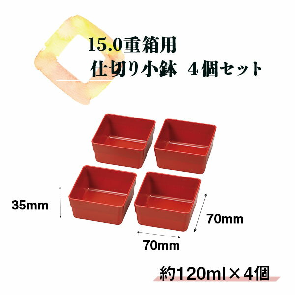 商品説明サイズ70×70×35mm (約120ml×4個)※15.0重箱用の仕切り小鉢です。 素材PS 商品説明◆電子レンジ・食洗機対応不可×◆ モニターの発色具合によって実際の商品と色が異なる場合がございます。