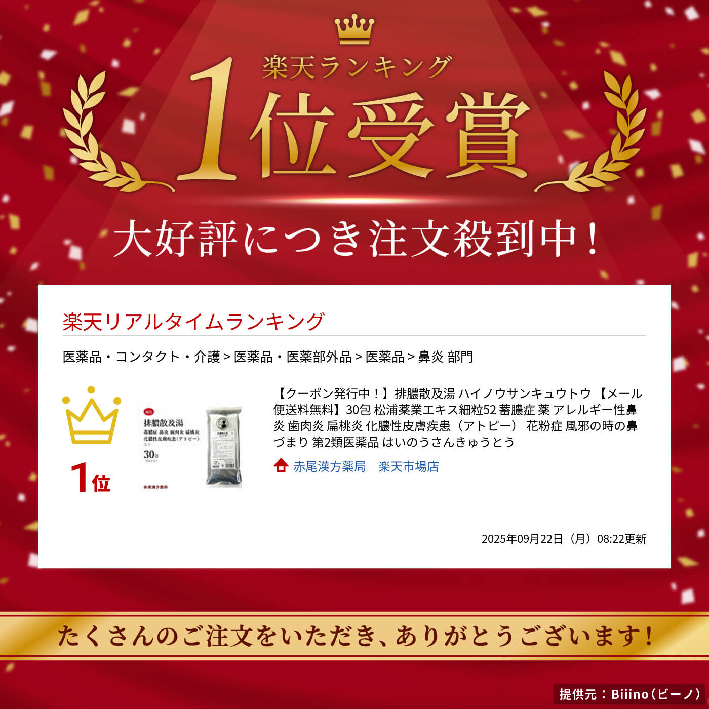 【クーポン発行中!】排膿散及湯 ハイノウサンキュウトウ 【メール便送料無料】30包 松浦薬業エキス細粒52 蓄膿症 薬 アレルギー性鼻炎 歯肉炎 扁桃炎 化膿性皮膚疾患(アトピー) 花粉症 風邪の時の鼻づまり 第2類医薬品 はいのうさんきゅうとう