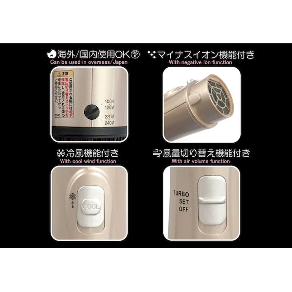 【商品説明】●日本でも海外でも使える電圧切替式のマイナスイオンカールドライヤー。(電圧切替100-120V/220-240V)●髪の流れを整えられる冷風機能付きでしっかりスタイリングできます。●電源スイッチで2段階の風量調節が可能。●専用カールブラシは着脱可能のためコンパクトに持ち運びできます。