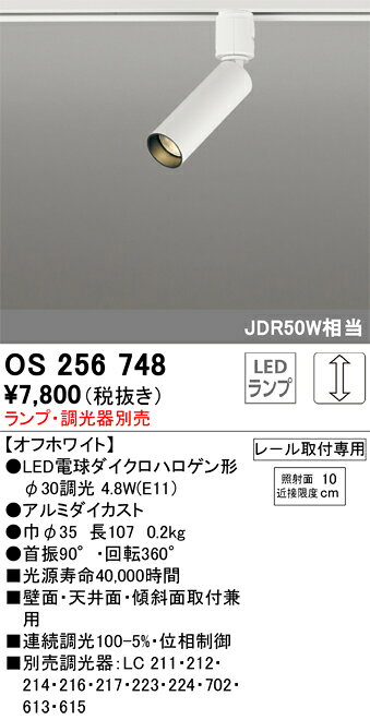 【仕様】●メーカー:オーデリック/ODELIC●型番:OS256748●JANコード:4549727009003●スポットライト●JDR50W相当●調光可能●レール取付専用●ランプ・調光器別売