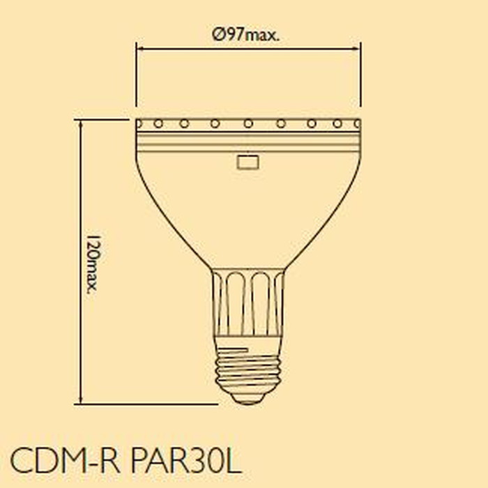 【仕様】●メーカー:フィリップス●型番:CDMR70W830PAR30L10°●JANコード:8727900887082●光色:電球色●色温度:3000K●ビーム光束:4850lm●ビーム角:10°●最大光度:68000cd●演色性:Ra83●定格寿命:9000時間●定格ランプ電力:70W●口金:E26●点灯方向:任意●UVカット機能付