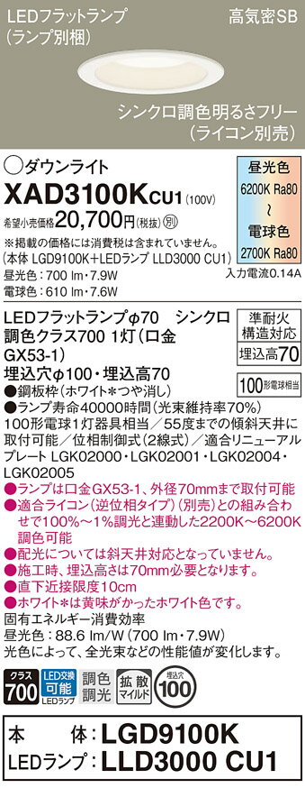【ご注文合計25,001円以上送料無料】パナソニック XAD3100KCU1 『LGD9100K+LLD3000CU1』(ランプ別梱包) ダウンライト 【高気密SB形】 畳数設定無し LED T区分 安心メーカー保証