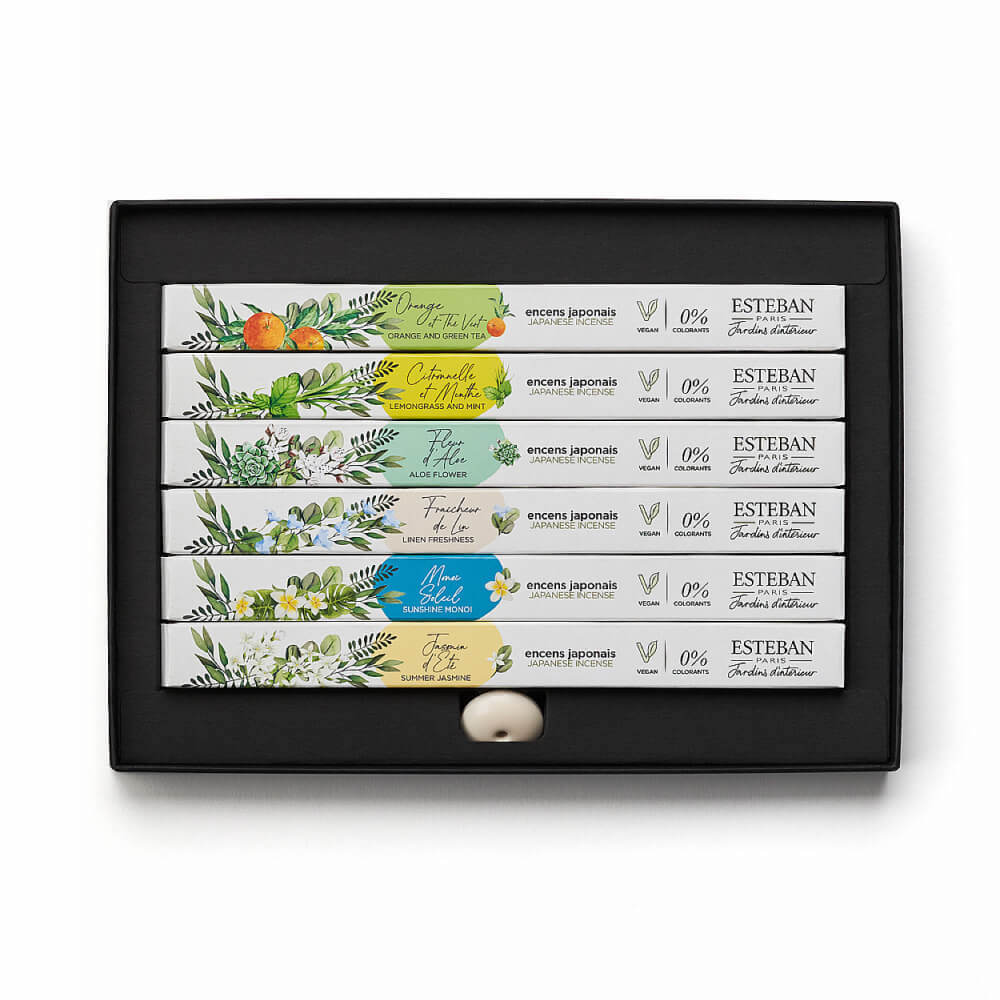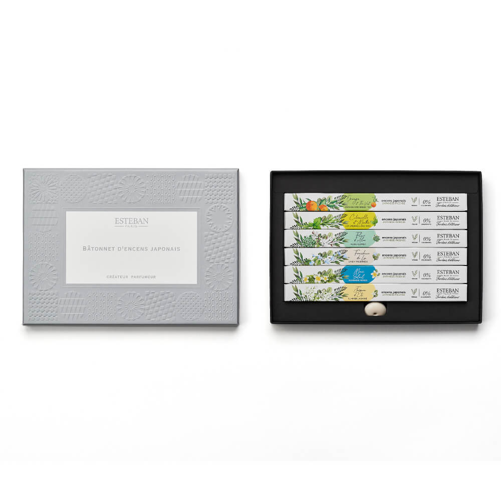 品名 バトネコフレ インテリアガーデンナチュール 香りの特徴 オレンジ&グリーンティー:オレンジとグリーンティーのすっきりと目覚めるような感覚をもたらすアロマティックシトラスの香り レモングラス&ミント:すっきりとしたレモングラスと、清涼感のあるミントの葉の涼やかで爽やかなフレッシュシトラスの香り アロエフラワー:ピュアなアロエとフレッシュでみずみずしい花々のアクアティックフローラルの香り フレシュールリネン:清潔なリネンがオレンジブロッサムとジャスミンの花を柔らかく包み込む甘いムスキーフローラルの香り モノイソレイユ:楽園に咲くティアレがビーチから吹き抜けるあたたかい風に揺れるソーラーフローラルの香り サマージャスミン:そよ風に揺られ太陽の陽ざしがさしこむジャスミンのパウダリックフローラルの香り 総重量(Gross Weight) 約135g 内容量(Net Weight) ・お香(各12本入) オレンジ&グリーンティー、レモングラス&ミント、アロエフラワー、フレシュールリネン、モノイソレイユ、サマージャスミン ・簡易丸型香立 燃焼時間 約25分 (使用環境や成分によって燃焼時間にバラつきが生じます。) サイズ 横幅192mm / 高さ140mm / 奥行22mm ご注意 お香の先端に火をつけ、炎を消した後、付属の香立ての穴に立て、灰が落ちないように不燃性のお皿を敷いて焚いてください。 製造元 日本香堂 Nippon Kodo 検索キーワード(共通)お香 香 葉っぱのお香 葉 はっぱ アロマ aroma HA KO 白 黒 しおり 手紙 匂い香 和紙 紙 文香 匂い袋 香り袋 癒し リラックス 部屋 お部屋香 ルームインセンス 室内香 インセンス incense aroma ギフト プレゼント 可愛い 珍しい おしゃれ お洒落 オシャレ カラフル いろいろ 薫寿堂 日本製 メイドインジャパン 国内製 安心 火 火をつける 燃える 香皿 香炉 香立 香立て 香り 香木 香水 ハーブ クリスマス クリスマスプレゼント 誕生日 バースデー birthday present リラックス インテリア 新しい めずらしい ちょっとした 贈答用 贈答 送料無料 送る 贈り物 ギフト 包装 包装無料 熨斗 熨斗無料 メッセージ オリジナルメッセージ 手提げ袋 返礼 返礼品 検索キーワード(個別) バトネコフレ インテリアガーデンナチュール フランスのESTEBANで日本のお香は、その繊細なスティックの形状からバトンショコラを想起させるような『B?tonnet (バトネ)』と呼ばれています。 ショコラトリーに並ぶバトンショコラのように、6種類のバトネ(お香)をお楽しみいただけます。 ※簡易香立付 お部屋にお香をくゆらせれば、ESTEBANの旅する香りの物語に、心地よく誘われます。 【セット内容】 ・お香(各12本入) オレンジ&グリーンティー、レモングラス&ミント、アロエフラワー、フレシュールリネン、モノイソレイユ、サマージャスミン ・簡易丸型香立 必ず不燃性のお皿を敷いてご使用ください。 400年以上にわたって育まれた日本伝統の薫香技術を用いて、洗練された香りを表現し、日本で丁寧に作り上げています。 お香の先端に火をつけ、炎を消した後、付属の香立の上に挿し、焚いてください。 燃焼中だけでなく、火が消えた後の残り香もお楽しみいただけます。 バトネコフレ クラシック バトネ&香皿コフレ クラシック バトネコフレ インテリアガーデンナチュール バトネ&香皿コフレ インテリアガーデンナチュール 香皿 ブラック 香皿 ホワイト