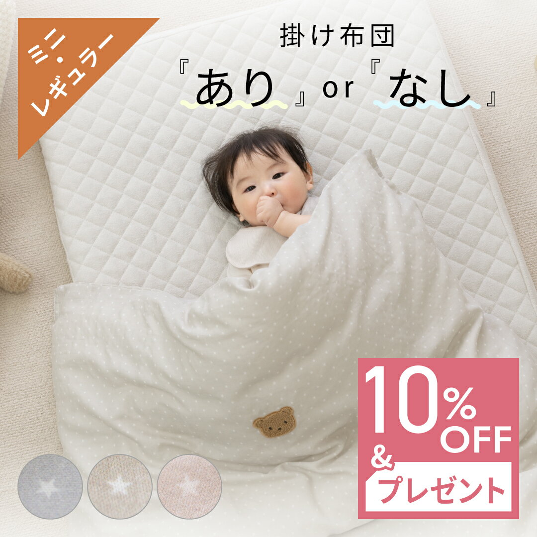 製品仕様 商品名 サイズと中綿が選べるベビー布団セット スターベア セット内容およびサイズ 【レギュラーサイズ】 ●掛カバーリング:約縦125×横100cm ●掛布団中綿:約縦125×横100cm ●敷布団:約縦120×横70×高7cm ●枕:約縦22×横25cm ●ピッタシーツ:約縦120×横70cm 【ミニサイズ】 ●掛カバーリング:約縦100×横80cm ●掛布団中綿:約縦100×横80cm ●敷布団:約縦90×横60×高7cm ●枕:約縦22×横25cm ●ピッタシーツ:約縦90×横60cm 素材/材質 ●綿100%(二重ガーゼジャカード) ●掛布団中綿: ポリエステル、フレッシュ、ソフトアズクラウド:ポリエステル100%/羽毛:ダウン90%・フェザー10% ●敷芯:エコホールサンドマット ●枕:中身 ポリエステル綿 ●ピッタシーツ:綿100% 色 グレー ご注意事項 モニターの発色の具合によって実際のものと色が異なる場合がございます。ご了承ください。 その他商品説明 肌に触れる素材や縫製にこだわり、いつも清潔・快適にお使いいただける日本製のお布団セットです。お布団のサイズと掛布団の中わたをお選びいただけるカスタマイズ布団です。いろんな方向を向いたかわいいくまさんたちが、今日も赤ちゃんの夢をそっと見守っています。 【素材】やわらかな二重織りのガーゼは吸水性が高く乾きやすいのが特徴。一年中使いやすい素材です。 中芯を入れた時のふんわり温かな掛布団としてだけでなく、中芯を抜いてガーゼケットとしてもご使用いただけます。 【掛布団中綿】ポリエステル:軽くて保温性に優れ、ベビー用ふとんわたとしても最もポピュラーな素材のポリエステル綿です。 フレッシュ:繊維1本1本の中に7つの空気孔を持っており、その中にたくさんの空気を含むことでふんわりあたたかい特徴の綿です。ソフトアズクラウド:雲のようなふっくら感があり、羽毛のような特殊ポリエステル綿です。羽毛:ボリュームがあり、ふんわりと軽く保温性に富んだ素材です。放・吸湿性に優れているので、体温調節機能が未発達の赤ちゃんに最適です。 【敷布団】赤ちゃんの為の最高の敷布団、エコホールサンドマット(高機能三層構造)。通気性に優れ、大人以上に汗をかく赤ちゃんも快適に眠ることが出来ます。また適度な固さで背骨もしっかり支えます。【お手入れ方法】 ・掛カバーリング 綿素材は合成洗剤で洗えますが、生成や淡色のものは蛍光増白剤の入っていない洗剤で洗ってください。 プリントものは濡れたままの状態で放置すると、色移りの原因になりますので、脱水後は出来るだけ早く形を整えて干してください。(約30分) 洗濯するときは必ずファスナーを閉じてください。 ・掛布団中綿(ポリエステルわた) 押し洗い程度にして、中わたが片寄らないようにしてください。 脱水を十分にし、天日干しをして、よく乾燥をしたことを確認のうえ、中わたをよくほぐして取り込んでください。 長時間天日干しをした場合は、結露の原因になりますので、風通しの良いところに干して、湿気を除去してからお使いになるか収納してください。・掛布団中綿(フレッシュ/ソフトアズクラウド)洗濯機をご使用の場合は、「大物コースまたは布団コース」に設定し縦に二つ折りにして、端から円柱状に丸めて単体で洗って下さい。 充分すすいだ後、よく脱水して下さい。・掛布団中綿(羽毛)洗濯機をご使用の場合は、「大物コースまたは布団コース」に設定し30℃以下の水で、中性洗剤で洗って下さい。充分すすいだ後、よく脱水して下さい。中まできちんと乾かない場合もあるので、その時は2日にわたって干すようにしましょう。 取り込んだ後、風通しの良い場所で2〜3時間干し、軽く叩いて詰め物の片寄りを直して下さい。 (乾燥が不十分ですと異臭の原因になります) ・敷布団の側 洗濯後の縮みにより中身が装着しにくくなりますので、できるだけ洗われないようにしてください。 どうしても水洗いが必要な時は、ファスナーを閉じて洗濯ネットに入れ、他の洗濯物にからまないようにして洗ってください。 洗濯後若干の縮みがありますので、中身を入れるときに多少の力が必要になります。 干す前にたて、よこ方向ともよく伸ばしておくと縮みが少なくなります。 ・敷布団の中身 敷きふとんの中身は、通気マットの材料であるパームの繊維が折れますので、洗濯はお避け下さい。 できるだけキルトパッド、防水シーツを敷いて、中身が汚れないようにご使用ください。 もし、汚れた場合はその部分だけタオルなどに水を含ませ汚れを吸い取ってください。 ・シーツ シーツにゴムが入っているので、洗濯槽から取り出すときに他の洗濯物と絡み、ゴムが伸びきってしまう恐れがありますので、洗濯ネットに入れて洗ってください。