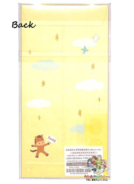 毎年 大変ご好評をいただいております、 サークルシールでおなじみ リュリュさんの おとしだま袋です♪ ★長札用お年玉袋です。 2026年(令和8年)の 干支 午年デザイン♪ ★お札を折らずに そのままお入れ頂くタイプとなります♪ ★新札、新券に折目を入れずに お渡しすることができます。 ★美しい色使い♪ 縁起の良いイラスト♪ ★「おとしだま」の文字は、金箔押しです。 ★キュートさと 上品さを 併せ持った ステキなポチ袋です。 ★封止めシールも付いて嬉しい! お年玉入れに、お小遣いなどをお渡しの際に 便利です。 ほんの気持ち、お心付け、寸志などをそっとお入れしてお渡しすることのできるぽち袋です♪ ぜひお役立てくださいませ☆ ★サイズ:約H170×W85mm×D3mm ★同柄3枚入り ★材 質:和紙 ★金の箔押し加工 ★封緘シール付きです ★お札を折らずにお使い頂くタイプです。 ★日本製 ★RYURYU / リュリュ ★午(うま)は、 「挑戦」「目標」「飛躍」などの意があると云われます。 「馬九行久(うまくいく)」など、物事がすべてうまくいくように・・・という願いを込めた語呂合わせなども有名で、福を運ぶ動物としての、特別な意味を持っています。 ※ご注意をお読みいただき、本製品のお取り扱いをお願い致します。 ※当サイト内、すべての 文章・写真などの 複製・転載を 禁じます。 Aplenty Kind Galleria 🌼そのほかのポチ袋はこちらから🌼※当サイト内、すべての 文章・写真などの 複製・転載を 禁じます。