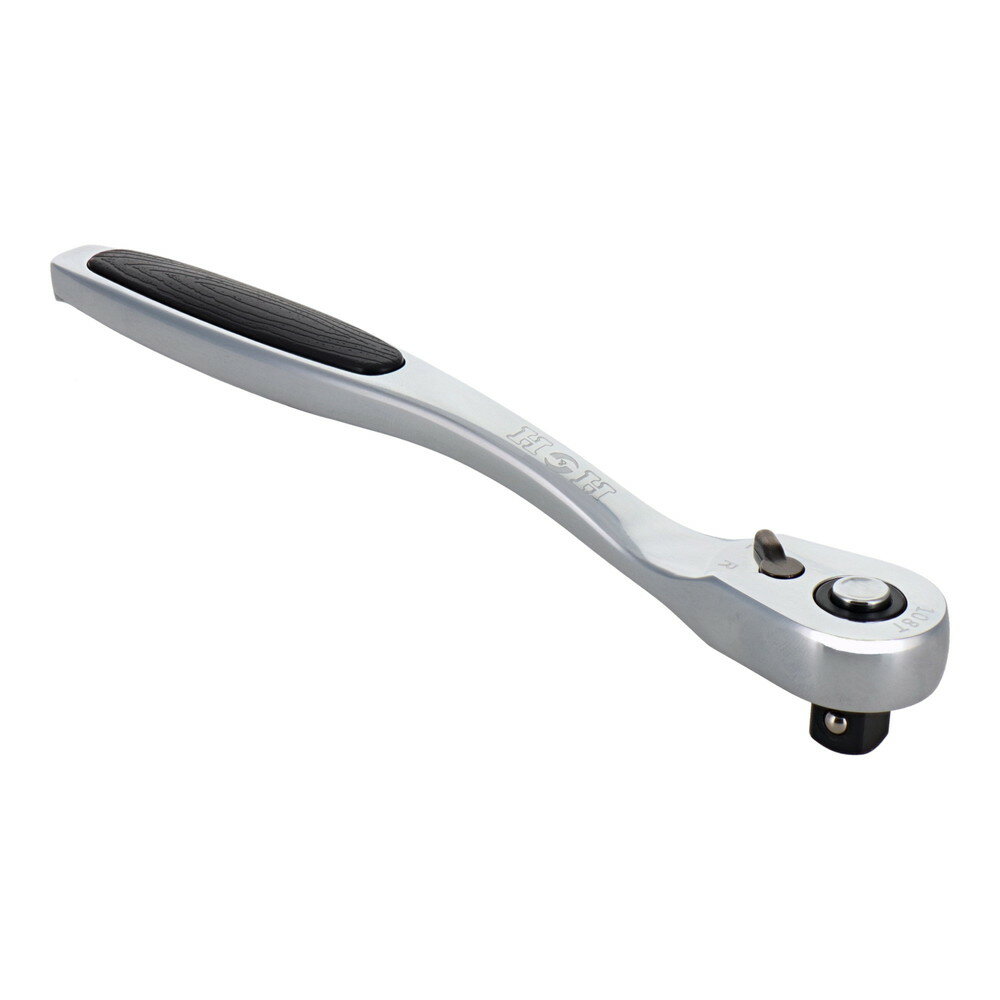 SK11 スタビーラチェットハンドル SRH3CS手の中に収まるコンパクトボディで、レンチ長の限られた場所で威力を発揮します。ソケットと組み合わせ、六角ボルト・ナットやネジの締付け、緩め作業。ワンサイズ小さく設計された極小ヘッドは、従来商品では使用できない、より窮屈なスペースでの作業が可能です。ギア数72山採用で、振り幅の制限された狭い場所でも細かな送り角度で、操作性抜群です。●差込角:9.5mm(3/8インチ)。●ヘッド幅:27mm。●ヘッド厚:12.5mm。●全長:100mm。
