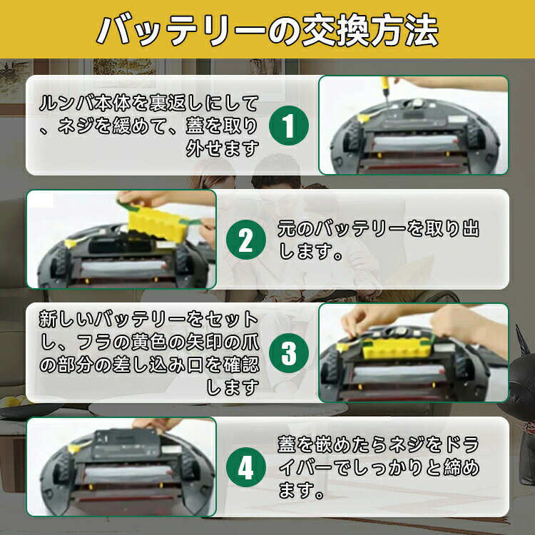 届出事業所名株式会社グリッターPSマークの種類PSE商品名iRobot社製ロボット掃除機ルンバ ニッケル水素互換用バッテリーi7500600700800900シリーズ用ご注意:e5は対応不可スペック電圧:14.4V容量:3500mAh電池:ニッケル水素電池カラー:パッケージの色は生産ロットにより、変わる場合があります互換適合機種ルンバi7500600700800900シリーズ全機種ルンバ510 525 527 530J 531 536 537 538 539 550 551 560 561570J 577 620 621 622 623 624 625 626 627 628 629 630 631 641 643650 654 680 690 760 770 780 790 870 871 875 876 878 880885 890 960 4419696)500-900シリーズであれば輸入版や掲載型番以外にも適合しますe5は対応不可特徴純正と同じニッケル水素バッテリーを採用しており、リチウムイオンより安全かつ純正と同じニッケル水素バッテリーのため、衝撃の多いルンバにも安心して使用いただけます。保証アフターサポート1.商品配達後、7日間以内、無条件無償でご返品頂けます。2.通常保証3ヶ月間、レビューを頂い方対象、保証が1年間となります。3.ご購入日から3ヶ月間(レビュー後、1年間)、製品に不具合が生じた場合、代替品で交換させて頂きます。4.在庫状況により交換品がないなど返金対応になる場合がございます。5.水没破損加工分解の形跡外観に大きな損傷過酷な使用状態と思われるものは、保証対象外となります。注意不具合が発生した場合、ご返送前に、返送品の状態などを確認させて頂く必要があります。ご購入から1ヶ月以上の場合は、保証期間内でも、交換送料はお客様負担となります。以下の範囲は当社の品質保証範囲外。水浸し、無断分解、重大な傷によるパッケージの破裂。以上の状況が発生した場合、有償での修理を承っておりますので、お気軽にご連絡ください。