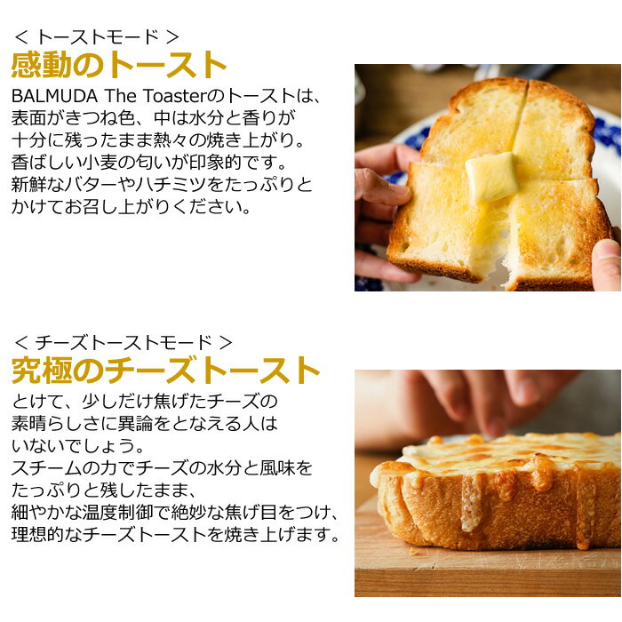 【2023年10月 リニューアル内容】 ・よりおいしく仕上がるよう、温度制御をアップデート ・表面も裏面もこんがり。理想的な焼き色を実現するために、焼きアミの形状変更 ・本体サイズはそのままに、庫内の奥行きを2cm拡大 ・新しいカラー・ショコラ登場■感動のトースター 多くの人の朝を変えた、BALMUDA The Toasterが新しくなりました。さらなるおいしさと使いやすさを追求し、パンの焼きあがりや庫内サイズをアップデート。 独自のスチームテクノロジーと緻密な温度制御が実現する、バルミューダだけの感動の香りと食感をお楽しみください。■バルミューダだけの特別なおいしさ おいしさは味と香り、そして食感から生み出されます。BALMUDA The Toasterは、独自のスチームテクノロジーと細やかな温度制御で、パンや料理の味わいを最大に引き出します。■特許取得のスチームテクノロジー パンの水分と香りを閉じ込め、表面はさっくり、中はもっちりふわふわ。バルミューダのトーストの食感のコントラストは、5ccの水から生み出されます。■独自の緻密な温度制御 各モードごとに、1秒単位で細やかに設定された温度制御。アップデートしてさらにおいしく、感動の焼きあがりを実現します。■おいしさを引き出すモード BALMUDA The Toasterは、パンの種類に合わせて最適に焼き上げ、特別なおいしさを引き出します。 用途に合わせてモードを選ぶだけ。誰でも簡単にパンやトースター調理を楽しめます。「リベイク」に最適なモードも搭載。 一般的なオーブントースターのようにお餅やグラタンなどの調理も可能です。リニューアルし、本体サイズはそのままに庫内の奥行きが2cm拡大。さらに使いやすくなりました。■料理の幅が広がるトースター調理 スチームを使わないクラシックモード。グリル料理やお菓子作りなど、さまざまなトースター料理に活躍します。■本体寸法:357mm(幅)× 321mm(奥行き)× 209mm(高さ)■庫内寸法:275mm(幅)× 224mm(奥行き)× 178mm(高さ)■製品重量:約4.1kg■電源:AC100V 50Hz/60Hz■定格消費電力:1300W■電源コード長さ:約1m■カラー ブラック(型番 : K11A-BK、JANコード : 4560330111709) ホワイト(型番 : K11A-WH、JANコード : 4560330111716) ショコラ(型番 : K11A-CW、JANコード : 4560330111747) グレー(型番 : K11A-GR、JANコード : 4560330111730)■運転モード:1. トーストモード / 2. チーズトーストモード / 3. フランスパンモード / 4. クロワッサンモード / 5. クラシックモード(170、200、230°C)■タイマー:1〜10 ・ 15分■スチーム:5ccボイラー■パッケージ内容:5ccカップ、取扱説明書(保証書付き)、ガイドブック■保証期間:お買い上げ日から1年間※本製品は日本国内専用です。海外での使用は保証および修理受付の対象外となりますのでご注意ください。商品の特長・仕様に関する詳細はメーカーホームページでもご覧頂けます。バルミューダ ザ・トースター BALMUDA The Toaster スチームトースター K11A-BK ブラック 2023年モデル オーブントースター■送料区分:120サイズ
