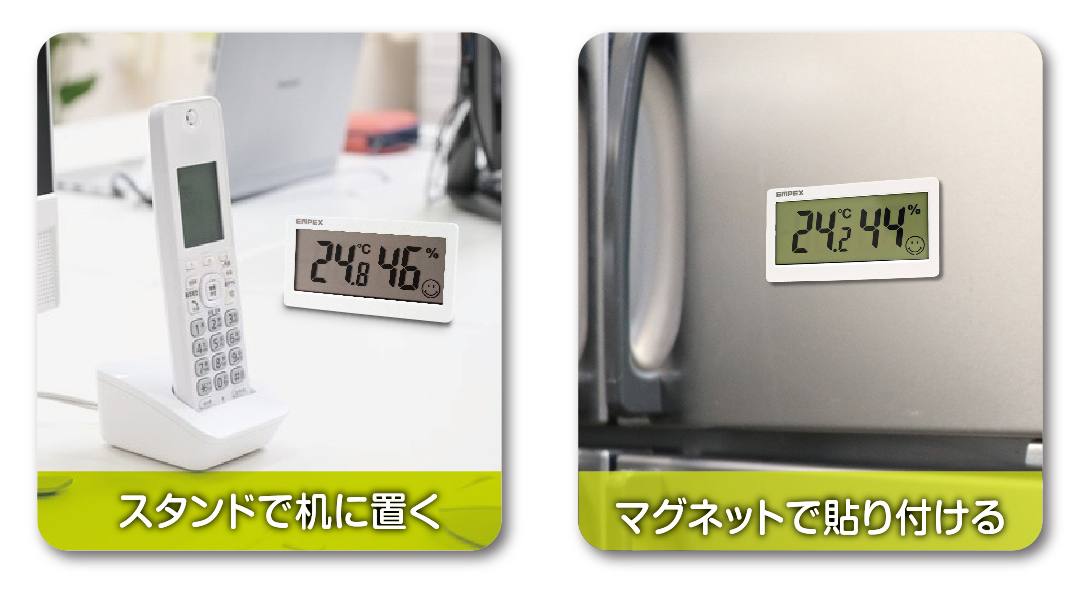 デジタル温湿度計おうちルーム温湿度計スリム TD-8511/TD-8512は、温度は0.1℃毎、湿度は1%毎に、デジタル表示するシンプルな温度・湿度計。 厚みが僅か18mmの薄型で、シンプルデザインのデジタル温湿度計なので、壁に溶け込みます。 現在の温湿度から快適かがわかるアイコンも表示。 約48×88×18mmで重さ41gの小型サイズながら、文字高は2.1cmで視認性もバツグン! 背面に強力磁石がついていますのでホワイトボードや冷蔵庫などに貼り付けられます。僅か18mmの厚さなので、引っかけて落下させてしまうリスクも軽減されます。スタンドもあるので、卓上温湿度計としても◎ ホワイトまたはブラックの2色から選択できます。 温湿度計や気圧計の専門メーカー、エンペックス気象計(EMPEX)社製。 送料無料。メール便でのお届け。 ・品名 デジタル温湿度計 おうちルーム温湿度計スリム ・品番 TD-8511:ホワイト、TD-8512:ブラック ・測定範囲 温度/0〜+50℃、湿度/20〜90% ・温度精度 ±1℃(0〜40℃)、±2℃(その他) ・湿度精度 ±5%(40〜70%、常温)、±8%(その他) ・測定周期 約20秒 ・サイズ 約縦48×横88×厚18mm ・重量 41g ・電源 LR44×1(テスト用電池付属)