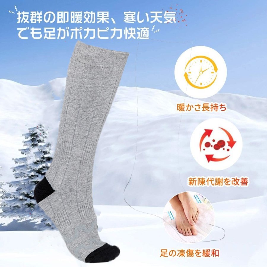 商品情報【防寒対策・暖かくなる】電熱ソックスの底部には赤外線炭素繊維電熱ヒーターが内蔵されて。高品質で安全な充電式ヒーターがつま先全体を覆っています。5秒でヒーターの周りが暖かくなり、電熱ヒーターで直接に温めるので暖房効果が高いです。底冷えから足を温めることで、全身の冷え予防になります。また、血液循環を改善し、寒い季節に足がひび割れたり傷ついたりするのを防ぎます。【3段階に温度調節可能】この電熱靴下は三つの加熱セットがあり、?単に調節できます。光るヒートスイッチで(高温:3つの青いライトが点灯します;中温2つの青いライトが点灯します;低温1つの青いライトが点灯します。)の3段階温度を調節でき。3段階調整モードで、さまざまな環境の下で自由に適切な温度を選択することができますが、それは靴下の使用時間を延長するのに役立ちます。【3.7V 4000mAh充電式リチウムバッテリー】加熱ソックスは二本の充電式リチウムバッテリーを内蔵されて、充電時間が約3~4時間です。加熱ソックスは最低の設定で約9時間、中程度の設定で約6時間、最高の設定で約3時間持続します。暖かさ長持ち、長時間の移動時や、デスクワークなどに最適です。そして、手洗いにも洗濯機にもOK、長くお使い頂けます。【着心地いい超高品質電熱靴下】この加熱ソックスは82%綿、8%ポリエステ10%弾性素材を採用しており、優れた防寒保温性能を実現しながら、吸収性、通気性、速乾性、伸縮性を備えます。耐久性が抜群、履き心地が快適な加熱靴下です。足先の寒さ対策とした靴下は靴下の底部にヒーターを内蔵したことで底冷えから足を温めることで、全身の冷え予防になります。加熱機能を使用しない場合は、普通の靴下としても適合します。【最高の贈り物、快適な冬を過ごす】日常生活、通学通勤などの日常的な用途だけでなく、スキー、スノーボード、釣り、ジョギング、狩り、サイクリング、ハイキング、登山などのアウトドアスポーツにも大活躍です。お年上の方に贈るだけではなく、ご家族や恋人、友たちにも素敵なプレゼントです。フリーサイズで、男女兼用です。【ご注意】●USB充電ケーブルからACアダプタ等でつけて充電する場合は必ず5v1A以内のものをお使いください。 ご使用不当の原因で損害が生じた場合、当社は一切に責任を負いかねますので、ご了承の上正しくお使いください。この商品は 電熱ソックス 電気靴下 4000mAh 最高65℃ 両面発熱 5-9時間持続使用 USB充電式 水洗い可 ヒーター バッテリー付属 暖かい靴下 厚手 冬用 防寒 保温 男女兼用 スキー用 バイク 自転車 狩猟 キャンプ メンズ レディース ポイント電熱ソックス 電気靴下 4000mAh 最高65℃ 両面発熱 5-9時間持続使用 ショップからのメッセージ 納期について 4