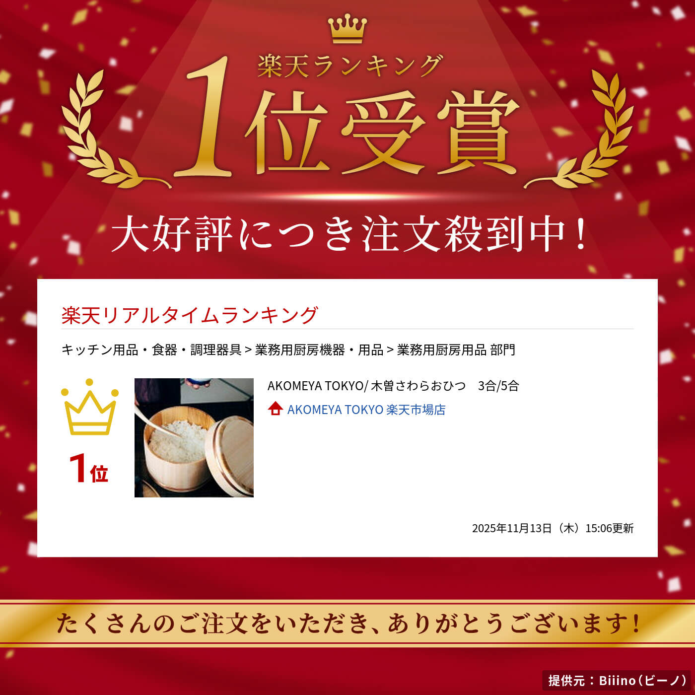 信州木曽産の極上のさわらでつくられたアコメヤオリジナルのおひつ 炊きたてのごはんをおひつに入れることで、炊飯器の保温モードを使ったり、冷蔵庫に入れるよりも、お米をおいしく保存することができます。 時間が経っても、ふっくら・もちもち。おいしいご飯を楽しめる お米は炊きあがった瞬間から、お米に含まれるデンプンの水分が抜けて粘りが失われていくため、味が劣化していくと言われています。そんなときに使いたいのが、炊いたお米を保存しておくために昔から使われている「おひつ」です。木製のおひつは炊き立てのお米の余分な水分を調節し、湿気や温度をコントールしてくれるため、炊飯器で保温しておくよりもおいしさを長く保つことができるのです。おひつに入れたご飯は、季節にもよりますが常温で2日程度保存可能。夜炊いたご飯をおひつに入れて、翌日の朝食やお弁当、おにぎりにしてもおいしいごはんが食べられます。 木製おひつの中でもとくに最適な「さわら」を使用 AKOMEYA TOKYOのオリジナルおひつには信州木曽産の極上のさわらを使用。木曽さわらは殺菌作用もあり、水に強く、耐久性にも優れているため、おひつに最適な素材です。おひつに使用される様々な木の中でも、においがつきにくく、お米本来の香りを楽しむことができます。 樹齢100年以上の木曽さわらの厳選した柾目材のみを使用し、一つ一つ職人の手で作られています。数枚の木の板を隙間なくつなぎ、滑らかなおひつに仕上げる工程は、一点一点手作業で行われています。 現代の食卓に馴染むように。アコメヤオリジナルのこだわり これまでのおひつと異なり、木の厚みを調整し、道具としての野暮ったさがないスッキリとした形状に仕上げました。一般的なおひつは身も蓋も箍(たが)は各2本ありますが、各1本として、インテリアに馴染むようスッキリした印象に仕上げました。さらに、蓋と身のサイズ感にもこだわりを。多くのおひつはかぶせ蓋が身に対して大きく、ごつい印象がありましたが、こちらの商品は蓋の直径と身の直径との差異を小さくしたことで、食卓テーブルに置いても違和感のない印象に仕上げています。 陶器・セラミック製のおひつとの違い 木製のおひつは、陶器やセラミックのおひつとは異なり、そのままレンジで温めることはできません。しかし、木がもともと持っている吸湿性により、陶器・セラミックのおひつにはない「ふっくら・もちもち」の美味しさを保つことができるため、「ご飯をおいしく味わいたい」という方には木製のおひつをおすすめしております。 サイズは炊く量+1合がおすすめ おひつのサイズについては、炊く量より1合大きいサイズをお選びいただくのがおすすめです。蓋をしたときにある程度余裕がある方が、空気が循環しておひつ本来の持ち味が発揮されます。3合と5合の2サイズをご用意しているので、お使いの炊飯器や土鍋のサイズに合わせてお選びください。 木製おひつの使い方、お手入れ方法 1.おひつを初めて使うとき、まずは米のとぎ汁をおひついっぱいに入れ3時間放置します。あく抜き、におい抜きの効果があります。洗ってしっかり日陰干しで、充分に乾燥させてから使い始めます。2. ごはんを入れる前は、おひつを水にくぐらせる必要はありません。水分の吸収をしてくれるので、水にくぐらせない方がその力を最大限に発揮できるのです。おひつの内側を乾いた布で拭きあげてから、ごはんを入れましょう。3.炊き立てのごはんを入れたら、乾いたふきんを蓋に挟んで置いておくと、ふきんがご飯の湯気を吸って、水滴が蓋についてご飯に落ちるのを防ぐことができます。4.使い終わったら、合成洗剤は使わずクレンザーや塩で内側と外側を洗います。その際隅々までやさしく洗浄できる棕櫚の束子がおすすめです。 洗い終わったら、風通しのいい日陰干しでしっかり乾燥させることが大切です。 おひつは、正しくお手入れすることで長く使える道具になります。 2サイズをご用意 ◎3合(直径18、高さ15 cm) ◎5合(直径21、高さ16.2cm) 2