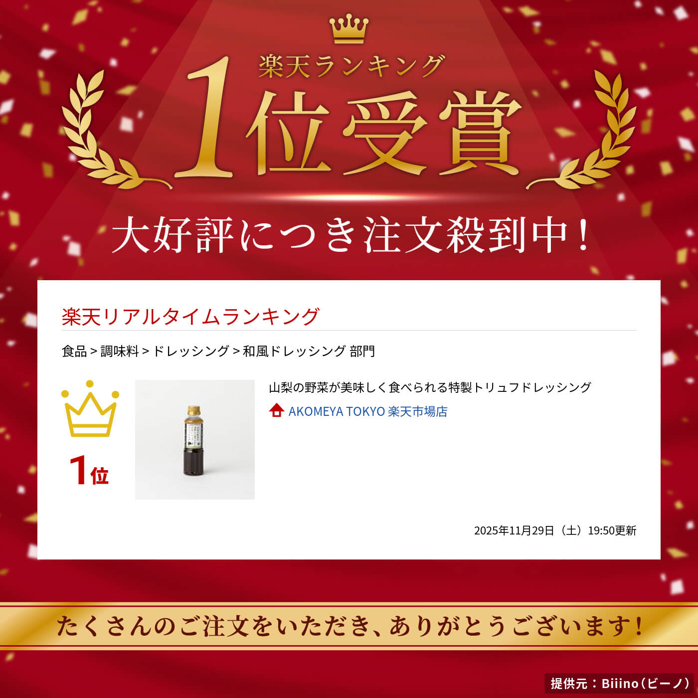 野菜が美味しく食べられる、香り豊かなトリュフドレッシング 2022年の「やまなしギフトコンテスト」にて優秀賞を受賞。「野菜が美味しく食べられるドレッシング」をコンセプトに、香り豊かなトリュフドレッシングに仕上げました。山梨県産の巨峰果汁を隠し味に入れています。野菜にかけるのはもちろんですが、お肉のソースとして使うのもおすすめです。 たくさんの高評価をいただいています! 「自分好みのドレッシングに中々巡り会えなかったのですが、こちらを試した所『やっと見つけた!』って感じでハマりました(^○^)ほんのりトリュフの香りでとても美味しいです♪「ドレッシング界ナンバーワン!すでにリピ済み。濃い味(トリュフもしっかり)なのでドレッシング少量でたっぷり野菜食べれます!」「野菜嫌いな夫がこれをかけるとばくばく食べます。びっくりです。」「とても美味しいドレッシングです!我が家ではお肉のソースにも使っています!重宝しています(^^)」「サラダにはもちろんですが お肉の漬け込みに使うととっても美味しいです。気に入り過ぎて箱買いしました。(^。^)友達と姉妹にもお土産でプレゼントです。」 アコメヤおすすめの調味料は他にも! AKOMEYA TOKYOではドレッシングはもちろん、お出汁や基本調味料・スパイスなど、たくさんの調味料を取り扱っています。スタッフおすすめの調味料や、メディアでも話題のアイテムをまとめたので、ぜひこちらもチェックしてみてくださいね。 おすすめの調味料特集はこちら 2