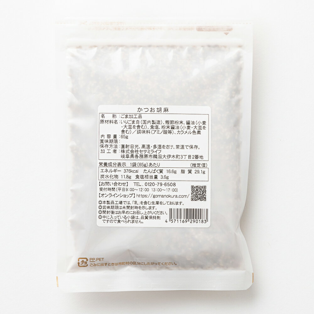 商品情報名称ごま加工品原材料名いりごま白(国内製造)、鰹節粉末、醤油(小麦・大豆を含む)、食塩、粉末醤油(小麦・大豆を含む)/調味料(アミノ酸等)、カラメル色素内容量65g賞味期限製造日より180日保存方法直射日光、高温・多湿をさけ、常温で保存加工者株式会社セサミライフ岐阜県各務原市鵜沼大伊木町3丁目2番地株式会社セサミライフ/鰹胡麻 あこめや アコメヤ ふりかけ 陸の幸であるごまと、海の幸である鰹の見事な味の融合が楽しめるふりかけ。未熟種子を取り除いた高品質の完熟胡麻に、特殊微粉砕加工した鰹節を一粒ごとに合成結着剤を使用せず、むらなくコーティングし濃厚な旨みの味胡麻に仕上げました。シンプルにご飯にふりかける他にも、ご飯全体にまぶしおにぎりを握っていただいても美味です。うどん、そば、お好み焼きのトッピングにもどうぞ。 2