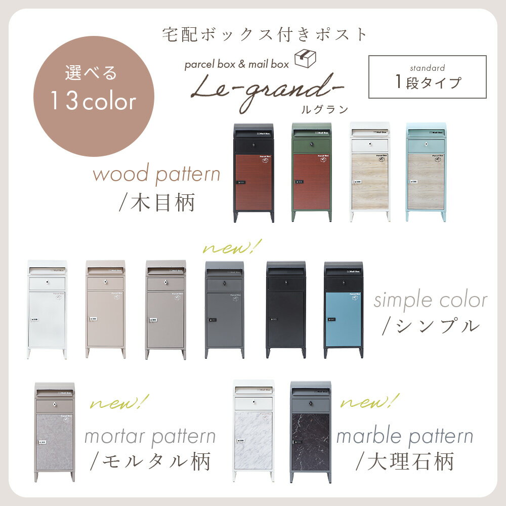 商品について 宅配ボックスと郵便ポストがひとつになった「ルグラン」。ダイヤル式のゼロリターンキーを採用しており、番号が自動でリセットされる仕組みのため防犯性に優れています。郵便受けも宅配ボックスもどちらも大容量で、通販の荷物や郵便物をまとめて受け取れるのが魅力です。 本体にはガルバナイズド処理を施したスチールを使用し、粉体塗装で仕上げています。サビや紫外線に強く、屋外でも安心して長く使えます。印鑑ケースやメッセージプレート、非常用鍵などの付属品も揃っており、使いやすさにもこだわりました。 木目調やモルタル調、大理石調など外観に合わせて選べるデザインを豊富に展開。玄関やエントランスに馴染む落ち着いた雰囲気で、住宅はもちろん、オフィスや店舗にもおすすめの宅配ボックスです。 商品詳細 商品名 宅配ボックス付きポスト【Le-grand-(ルグラン)】1段 ゼロリターンキータイプ 素材 構造部材:金属(鉄)…錆びの発生を抑えるガルバナイズド処理が施されています。 表面加工:粉体塗装 サイズ 【新仕様】 本体外寸:約幅45×奥行35.5×高さ111cm ・メールボックス 投函口:約幅36×高さ4.5cm 取り出し口:約幅35.5×高さ10cm 内寸:約幅44×奥行29.5×高さ36cm ・宅配ボックス 取り出し口:約幅35.5×高さ57cm 内寸:約幅44×奥行29.5×高さ60.5cm 重量 本体:約20kg 生産国 中国 備考 お客様組み立て品 ※説明書はボックス内にございますので到着後にご確認ください。 ・印鑑ケース ・メッセージプレート ・ポスト用鍵×2 ・非常用鍵 ●南京錠は付属しておりません● 【ご使用上の注意】 本製品は完全防水ではございません。 雨天時にはどうしても雨が侵入してしまいますため、屋根のある場所へ設置してください。 また、長時間雨ざらしにしたり日光に当て続けると、変色・錆の原因となります。 より永くご愛用いただくため設置場所・ご使用方法を守っていただき、定期的なお手入れをお願い致します。 ※台風等の悪天候の場合には、屋内の安全な場所へ移動させてください。 【FAQ】こちらの商品の特徴・注意事項について ※必ずお読みください※ ※店舗内の全商品において、サイズ表記は(約)での表記でございます。±1〜2cm程度の誤差は許容範囲内と判断し出荷しておりますので、予めご了承下さい。 ※印鑑はお客様にてご用意ください。ボックス内に印鑑のご用意がない場合、受領印を押せないため配達が完了できません。 ※宅配ボックスおよびボックス内の宅配物の盗難や品質劣化につきましては、一切の責任を負いかねます。予めご了承ください。 ※2022年7月、2023年11月、2024年11月より、お客様の声にお応えし仕様をリニューアルいたしました。 ※商品リニューアル以前のレビュー内容には、現行商品と差異のある内容が含まれております。あらかじめご了承ください。 ※個体差やロット・モニター環境により、色味やサイズが若干異なる場合がございます。予めご了承の上ご注文くださいませ。 組立について 【脚の取り付けについて 】 脚のお取り付けを頂く際は、全てのボルトを一度仮止め程度につけて頂き 外側のボルトより順に様子を見ながら締めて頂きますようお願いいたします。 この際に、脚が本体フレームに対して真っすぐと固定されておりますことをご確認ください。 真っすぐと固定されておりましたら、左右内側2点のボルトは固定する程度に軽く止めて頂きますようお願い致します。 (※左右内側2点のボルトを強く締めすぎますと、本体の構造上、脚が内側に傾きやすくなってしまいます。) メーカー希望小売価格について メーカー希望小売価格はメーカーカタログに基づいて掲載しています よく検索されるキーワードポスト一体型 宅配ボックス 宅配ポスト 置き型 補助金 スタンドポスト ダイヤル式 ダイヤルロック オシャレ 北欧 一戸建て用 郵便ポスト かわいい スタンドポスト 後付けポスト クロネコ 置き型ポスト 置き配 ダイヤルロック 工事不要 ポスト スタンド 自立型ポスト メールボックス 回覧板が入る A4対応 雑誌掲載 デザイン シンプル 防犯対策 転倒防止 ダイヤル式 施錠 住宅誌紹介 雑誌掲載 新築祝い アンカー穴 黒 ブラック 表札 開店祝い ヤマソロ 楽天ランキング デザイン 助成 ブラック ベージュ カーキ グリーン ブルー ホワイトカラーバリエーション 商品詳細 商品名 宅配ボックス付きポスト【Le-grand-(ルグラン)】1段 ゼロリターンキータイプ 素材 構造部材:金属(鉄)…錆びの発生を抑えるガルバナイズド処理が施されています。 表面加工:粉体塗装 サイズ 本体外寸:約幅45×奥行35.5×高さ104.5cm ・メールボックス 投函口:約幅36×高さ4.5cm 取り出し口:約幅35.5×高さ9.5cm 内寸:約幅44×奥行29.5×高さ34cm ・宅配ボックス 取り出し口:約幅35.5×高さ50.5cm 内寸:約幅44×奥行29.5×高さ56cm 【新仕様】 本体外寸:約幅45×奥行35.5×高さ111cm ・メールボックス 投函口:約幅36×高さ4.5cm 取り出し口:約幅35.5×高さ10cm 内寸:約幅44×奥行29.5×高さ36cm ・宅配ボックス 取り出し口:約幅35