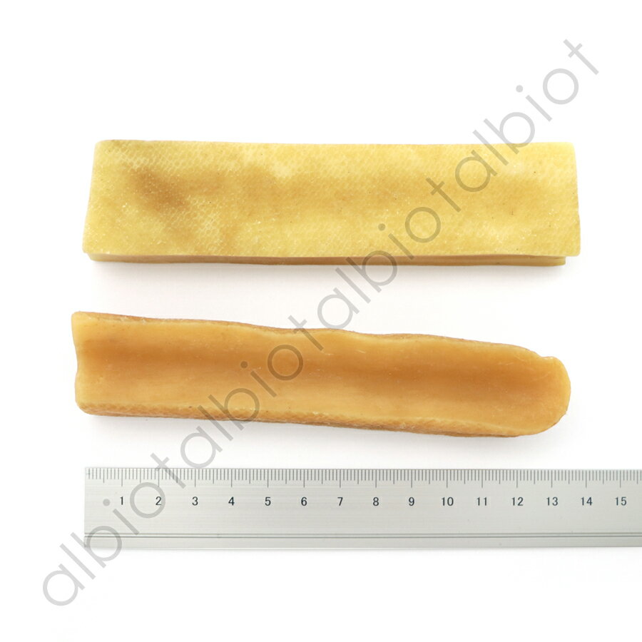 LINEのお友達限定クーポンをお見逃しなく♪ 原材料 ヤクミルク、牛乳、ライム果汁 保証分析値 粗タンパク質 69.5%以上、粗脂肪分 0.5%以上、水分 12.7%以下、灰分 6.2%以下 カロリー 370 kcal / 100g 製品情報 犬用おやつ BHA・BHT・エトキシキン等の人工保存料や人工香料・人工着色料は一切使用しておりません。 原産国 ネパール ご注意ください ※とても嗜好性が高いため、噛まずに飲み込む恐れがあります。きちんと噛むように最後まで十分ご注意ください。 ※冷暗所で保管し、開封後はお早めにご使用ください。 ※天然の原材料を使用し、人工の着色料や香料を使用していないため色や匂いサイズにばらつきがあります。 ※賞味期限の表記は、左から、年・月・日となります。 賞味期限 M 70g: L 100g: 関連商品 [DOG] アルビオ ヤクチーズ各種 [DOG] トリーツ ガム・骨 [DOG] トリーツ ボーロ・チーズ世界の屋根、ネパール・ヒマラヤの高山地帯で育てられたヤクの新鮮なミルクと牛乳を使った愛犬用おやつ、ヤクチーズ。 もとはネパールやインド、チベット、ブータンなどに暮らすチベット系民族の貴重な保存食として、古くから利用されてきました。 ヤクは標高4000m以上の高地に生息する家畜で現地では荷役や乳用、毛糸、食用などに重宝されとても大切に育てられています。 無農薬で育った草を食み、厳しい環境で暮らすヤクのミルクは栄養満点で、良質なタンパク質や必須アミノ酸を豊富に含みます。一頭のヤクから採れるミルクは、一頭の牛から採れるミルクの1/20ほどとも言われ、とても貴重なもの。 ヤクチーズは標高が高く、冷たく清浄な空気の中で作られるため雑菌が繁殖しづらく、雑菌の繁殖を防ぐために加塩する必要がありません。昔ながらの自然な風味が愛犬の食欲をそそります。 ヤクチーズの製造過程で乳糖を多く含むホエイ*を取り除きますので、乳糖分解ができない愛犬にも安心して与えることができます。またヤクチーズ の製造過程で加塩していませんので、塩分過多になる心配はありません*。人工的な添加物や保存料などは無添加でオーガニックなおやつなので、愛犬に安心して与えることができます。 *乳清、チーズの上面に溜まる透明な水分のこと*減塩のヤクミルクなので牛乳由来の塩分のみ含まれています。 例えば‥手作業でチーズを切るので、その際の加減で形が異なったり…燻製の際の火加減や置いている場所によってチーズの色がこんがりと濃い色に仕上がったり… それは、手作りしているからこそ出てくる違いですので愛犬に安心して与えていただけます。 お客様よりいただいたお写真です [nakata]さまよりご協力いただきました 名前:ニーナちゃん 性別:女の子 年齢:6歳 犬種:ボーダーコリー 体重:13kg 種類:ヤクチーズ(Lサイズ) [ルーキー]さまよりご協力いただきました 名前:LIUTOくん 性別:男の子 年齢:3歳 犬種:ボストンテリア 体重:5kg 種類:ヤクチーズ(Lサイズ) [ルーキー]さまよりご協力いただきました 名前:マロンちゃん 性別:女の子 年齢:9歳 犬種:ゴールデンドゥードゥル 体重:36kg 種類:ヤクチーズ(Lサイズ) [I.J.]さまよりご協力いただきました 名前:キュンティアちゃん 性別:女の子 年齢:9歳 犬種:サルーキ 体重:17kg 種類:ヤクチーズ(Mサイズ) [I.J.]さまよりご協力いただきました 名前:ルーくん 性別:男の子 年齢:10歳 犬種:サルーキ 体重:22kg 種類:ヤクチーズ(Mサイズ) [Y]さまよりご協力いただきました 名前:tommyくん 性別:男の子 年齢:6歳 犬種:マルプー 体重:4kg 種類:ヤクチーズ(Mサイズ) [Y]さまよりご協力いただきました 名前:銀次くん 性別:男の子 年齢:5歳 犬種:ベルジアンタービュレン 体重:27kg 種類:ヤクチーズ(Mサイズ)