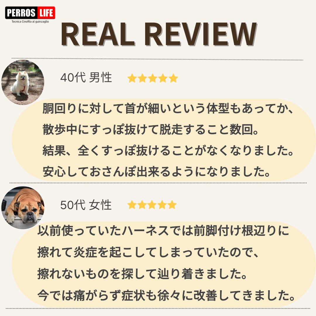 クラシックなH型・Y型ハーネスの進化形! Perros (ペルロス)ハーネスは犬たちへの究極の快適さを追求するために犬のエデュケーターが開発した犬のハーネス 犬のエデュケーターとは、日本ではあまり馴染みがありませんが、ペット先進国の欧州ではドッグトレーナーと並び、犬たちとのライフに大事な仕事とされています。 その仕事の役割は、犬ではなく"飼い主"に日常生活における犬の正しい飼育方法を伝えることです。 ペルロスハーネスはH型・Y型の形状したハーネスで、首や気管、肌への摩擦、脇の食い込み、その他痛みを与えにくいのはもちろんのこと、首回りに留め具があることで、着衣の際、頭を通すことが苦手な犬たちが恐怖心を抑えながら装着することが可能です。 Perros(ペルロス)ハーネスは、犬との生活の様々な状況で起こる問題に対し解決できるハーネスが明らかに市場で不足していることを受けて、長年動物病院で働いていた犬のエデュケーターである創業者のLucas G. Polidoroが問題解決に役立つハーネスとして2008年に造りました。 Perros(ペルロス)はヨーロッパの多くのドッグトレーナーや獣医師とのコラボレーションにより、ヨーロッパのドッグトレーニング施設で最も評価されるイタリアのブランドです。 【商品の特徴】 ・首回りがY型出首や気管を圧迫しにくい ・首回り、胴回り、胸からお腹までの5点調節が可能で、オーダーメイドしたようなフィット感 ※XSサイズ(PA10/S、PA10、PA10/L)はサイズが小さいため腹部のアジャスターはございません。 ・首回りに留め具があり前開きが可能!ハーネスを着用する際に頭を通すことが苦手な犬たちに、頭を通さず恐怖心を抑えながら着脱が可能 ・犬の肩や前脚の動きを邪魔せず拘束感や不快感を与えにくい ・胴回りのベルトが脇から離れているため、脇擦れや食い込みがなく痛みを与えにくい ・ベルトを繋ぐ円形のリングは可動性があるためより犬の体や動きにフィット ・散歩中すっぽ抜けにくいので安心 ・ドッグエデュケーターが犬のためを思って開発 ・ヨーロッパのドッグトレーニング施設で最も評価される ・ナイロン素材のベルトは引っ張り強度・耐久性がよく、しなやかなさわり心地で肌触りも柔らか ・サイズ交換可能 ・5年保証 【素材】ナイロン ※職人さんが一つ一つ仕上げておりますので、商品によっては誤差が発生してしまいます。外寸は手で計測しているため、商品によっては若干の誤差が生じる可能性があります。予めご了承ください。 ※注意書き:犬さんにハーネスのサイズがあわない場合は抜けたり、痛みや摩擦を与えてしまう可能性がございます。愛犬にあったサイズをお選びください。サイズ交換の場合はお届け後の7日間以内にご連絡をお願い致します。弊社はペルロスの日本正規代理店です。弊社では犬さんと飼い主さまの幸せを願いながら、ペルロス商品を日本に広めております。しかし近年、転売や弊社の権利侵害をする会社が増えてお客様に迷惑をかけている業者さんが増えておりますので、ご購入の際はAlice's Dog & Catのショップであることのご確認をお願い致します。 -------------------------------------------------------------- 画像はイメージです。 ※ PC環境により実際の色味や質感と異なって表示される場合がございます。 ※ 部品・パーツなどの一部の商品では本体の商品画像を使用しております。 ※ 製品の仕様・画像・パッケージは、メーカー側から予告なく変更される場合があります。 --------------------------------------------------------------