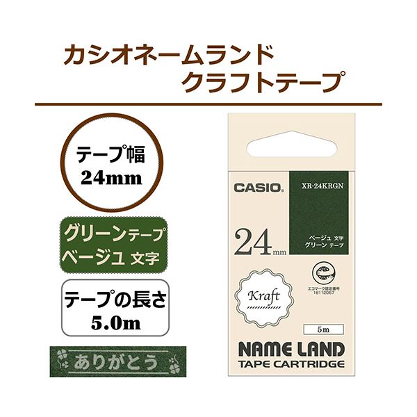 カシオ NAME LANDクラフトテープ 24mm×5m グリーン/ベージュ文字 XR-24KRGN 1個