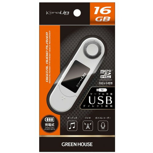 グリーンハウス GH-KANAUBS16-WH MP3プレーヤー KANA UB(16GB) ホワイト GHKANAUBS16WH発売日:2022年12月10日●USB充電式のデジタルオーディオプレーヤー本製品を使用するには、パソコンが必要です。●直接挿せるUSB充電で約16.5時間の音楽再生ケーブル不要でパソコンから充電、約3時間の充電で約16.5時間の使用が可能です。※バッテリーは使用環境や経年劣化などにより、充電時間や再生時間が変わります。また、内蔵バッテリーは交換できません。●内蔵16GBメモリー(約4000曲保存可能)+microSD/microSDHC(〜32GB)対応内蔵の16GBメモリーに加え、microSD/microSDHCにも対応しているので、容量を気にせずたくさんの音楽を楽しむことができます。※容量の一部はシステムで使用されます。※4分の曲を128 kbps、MP3形式で圧縮した場合の計算値※1フォルダあたり999ファイルまで●録音可能なFMラジオ機能搭載内蔵チューナーでFMラジオを楽しむことができます。録音も可能です。●AMラジオをFMで聴けるワイドFM(FM補完放送)対応AMラジオの番組がFM放送で聴けるワイドFM(FM補完放送)に対応しています。※放送エリア内でも、一部対象外となる地域がございます。※開始時期、放送局、周波数、聴取可能エリアなどは地域により異なります。詳細はラジオ局のホームページなどをご確認ください。●便利なボイスレコーダー機能搭載(最長510時間)内蔵マイクで録音できるので、ミーティングの議事録や講義の録音など、様々なシーンで活用できます。●多彩なイコライザ機能とプレイモードを搭載イコライザ機能とリピート再生やランダム再生など、多彩なプレイモードを搭載しています。 【仕様】ディスプレイ:1インチモノクロ液晶ディスプレイ画素数:128*64内蔵メモリー容量:16GB ※容量の一部はシステムで使用されます。対応外部メモリー:microSD/microSDHC(最大32GB)対応ファイル形式:MP3/WAV ※WAVファイルの再生は録音データのみ対応録音ファイル形式:WAV(リニアPCM)録音時間(内蔵メモリー16GB):約24時間(1536kbps) / 約36時間(1024kbps) / 約48時間(768kbps) / 約73時間(512kbps)ヘッドホン出力:最大8.7mWヘッドホンインピーダンス:32Ω音声周波数特性:20Hz〜20KHzFMラジオ受信周波数:76MHz〜108MHz搭載端子:ヘッドホン出力端子(ステレオミニ)×1/USB端子×1USB規格:USB2.0(HighSpeed)対応OS:Windows 11、10、8.1バッテリー:リチウムイオンバッテリーその他:再生時間(バッテリー):約16.5時間 充電時間(バッテリー):約3時間 動作温度範囲:0℃〜40℃ 動作湿度範囲:20%〜80% 外形寸法:W90×D27×H13(mm) 重量:約23g 保証期間:1年間付属品:専用イヤホン(約110cm)、取扱説明書、保証書
