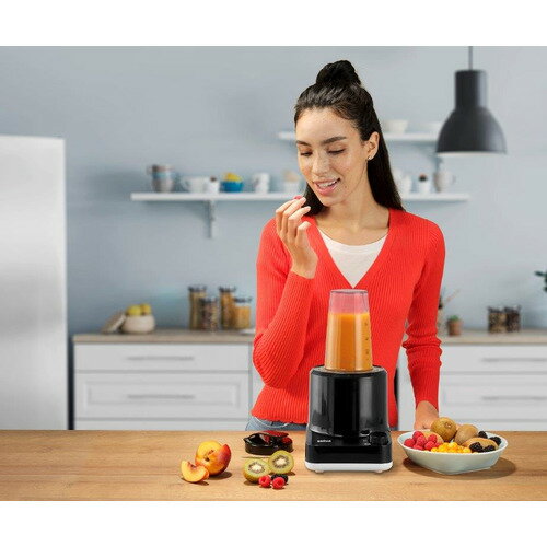 ブラウン JB1169BK ミル&ミキサー パワーブレンド 1 ブラック 発売日:2022年10月27日●独自のトライアングルジャグ三角形のジャグ構造により、食材の角が当たることで勢いのある対流を促し、素早く均一に食材を撹拌します。●スムースクラッシュブレードシステムゴールドチタンのブレード*が耐久性と切れ味の持続を実現、さらに独自のブレード構造により効率的に攪拌します。*ステンレス素材にコーティングしています●3つの安全構造本体とジャグをしっかり固定するジャグロックシステム、さらにモーターを過度な負荷から保護するためのモーター温度制御とモーター冷却システムの、3つの安全構造から成り立っています。●用途が広がるスムージータンブラーとミル、そして便利なタンパー付き1人分の量のスムージーなどをつくって、そのまま飲んだり持ち運びができるスムージータンブラー付きです。さらに、スパイスやコーヒー豆などを挽くときに便利なミル付き。ステンレス内面加工で清潔にお使いいただけます。タンパーは、蓋を開けずに、空回りしやすい葉野菜などを攪拌できます。調理した食材をかき出すときにも便利です。●2段階スピード+パルス2段階のスピードとパルスでコントールができるので、お好みの仕上がりを簡単に得られます。高速:個体を含んだ液体や重たい液体の攪拌に低速:軽い液体や温かいスープの攪拌にパルス:断続的な攪拌やアイスクラッシュ*に**家庭用の製氷皿でつくった氷(2cm角程度)を使用 【仕様】本体重量:約2700g *ガラスジャグ装着時コード長:0.9m電圧・周波数:AC 100V 50-60Hz消費電力:255W回転数:16、500回*無負荷時定格時間(1):ブレンダー:120秒定格時間(2):スムージータンブラー:60秒定格時間(3):ミル:60秒