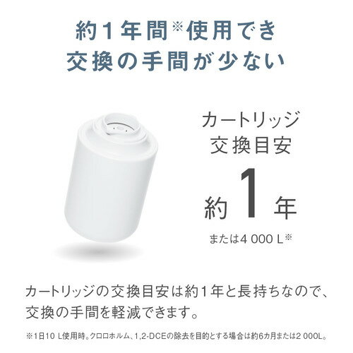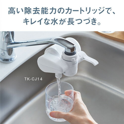 パナソニック TK-CJ14-W 浄水器 ホワイト TKCJ14W発売日:2024年3月1日●高い除去能力のカートリッジで、キレイな水が長つづき。●<長寿命>約1年間使用でき交換の手間が少ない。 ※1日10L使用時。クロロホルム、1、2-DCEの除去を目的とする場合は約6カ月。●<高除去>気になる19物質を除去。 気になる「PFOSおよびPFOA」を含む17物質を約4000L+2物質約2000L除去可能。●より使いやすく。 ・内ねじ用補助ねじを同梱。泡沫水栓にも対応。 【仕様】本体寸法:高さ7.5×幅12.5×奥行11cm本体質量:約310g(満水時:約450g)水切替レバー:○(泡沫原水ストレート、泡沫シャワー付)本体使用水温:浄水側:35 ℃未満(原水/シャワー:80 ℃未満)本体使用可能水圧(動水圧):70 kPa〜350 kPaろ過できる物質数(除去対象物質):19物質ろ過流量:1.8L/分(水圧100kPaの時)ろ材(カートリッジ)の取替(交換)時期の目安(※使用水量・水質・水圧によって大幅に短くなることがあります。※):約1年(1日10L使用時)※クロロホルム・1、2-DCE除去を目的とする場合は6か月ろ材の種類:不織布・活性炭・セラミック・中空糸膜付属品名称:浄水カートリッジ1個、固定具セット本体付属カートリッジ:TK-CJ24C1