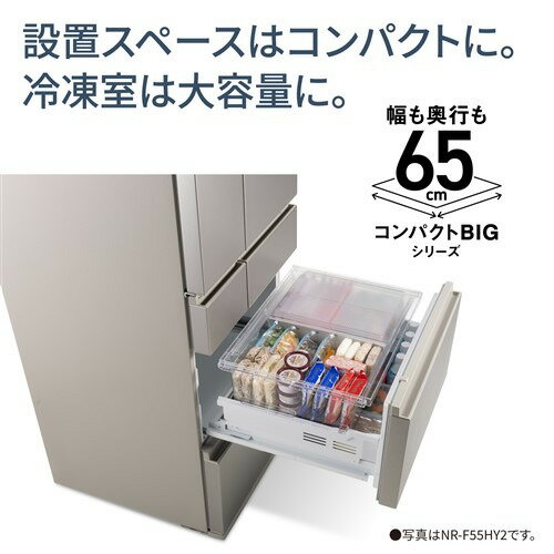 パナソニック NR-F50HY2-N 冷凍冷蔵庫 6ドア 501L フレンチドア ヘアラインシャンパン発売日:2025年4月25日●設置スペースはコンパクトに。冷凍室は大容量に。「霜つき抑制冷凍」搭載 ハイグレードモデル●キッチンにすっきり置けて、たっぷり入る大容量「コンパクトBIG」。省スペース設置可能で大容量。従来機種と比べて、設置寸法はそのままに、容量が約26Lアップ(※2024年商品 NR-F53HX1との比較。NR-F55HY2:幅650mm×奥行699mm、定格内容積551L、2024年商品NR-F53HX1:幅650mm×奥行699mm、定格内容積525L。※)。●上段も下段もたっぷり収納できる大容量なのに、整理しやすく・使いやすい「大容量冷凍室」。冷凍室が112L<71L>(※<>内の数字は食品収納スペースの目安※)の大容量なのに、「奥まで見えるフルオープン」でケースまるごと引き出せるから、奥まで見えて、取り出しやすい。さらに、深型の上段ケース採用で食品をタテ置き収納できるから、見つけやすく・整理しやすい。●冷凍食品の霜つきを抑えて、おいしさキープ(★当社調べ。冷凍室の上段ケースカバー内に効果があります。保存状況や食品の種類・状態や量、保存する前の食品の状況によって効果が異なります。★)(※実験条件:市販の冷凍ギョーザを開封し開封口を折り返しテープでとめて、冷凍室(上段ケースカバー内)で、4週間保存。外気温25度、扉開閉なし(当社測定)。牛ステーキ肉(もも肉)150gをラップ包装。クーリングアシストルーム内のアルミプレートの上に置いて急凍。凍結後、冷凍室(上段ケースカバー内)で4週間保存。外気温25度、扉開閉なし(当社測定)。※)「霜つき抑制冷凍」。上段ケースカバーが引き出しの開け閉めや保存中の温度変化から食品を守り、霜つきを抑えます(★当社調べ。冷凍室の上段ケースカバー内に効果があります。保存状況や食品の種類・状態や量、保存する前の食品の状況によって効果が異なります。★)(※実験条件:市販の冷凍ギョーザを開封し開封口を折り返しテープでとめて、冷凍室(上段ケースカバー内)で、4週間保存。外気温25度、扉開閉なし(当社測定)。牛ステーキ肉(もも肉)150gをラップ包装。クーリングアシストルーム内のアルミプレートの上に置いて急凍。凍結後、冷凍室(上段ケースカバー内)で4週間保存。外気温25度、扉開閉なし(当社測定)。※)。 【仕様】本体寸法(幅×奥行×高さ):650×650×1850mm(据付必要奥行寸法:650mm)本体質量:101kg定格内容積(※新JIS測定・計算方式 (JIS C 9801-3: 2015) に基づく表示※):501L各室容量(※新JIS測定・計算方式 (JIS C 9801-3: 2015) に基づく表示※)(※<>内の数字は食品収納スペースの目安※):■冷蔵室 定格内容積251L<190L>うち、パーシャル/チルド切替室<14L> ■製氷室 17L<4L> ■クーリングアシストルーム 28L<13L> ■冷凍室 101L<64L> ■野菜室 104L<73L>年間消費電力量 50Hz/60Hz:258kWh/年/258kWh/年定格消費電力:■電動機 86W ■電熱装置 179W省エネ基準達成率(※新:2021年度達成基準に基づく達成率※):1.09冷蔵室:・差替えドア棚 ・卵トレイ(卵収納量 12個) ・全棚ガラストレイ ・わけられるん棚(3段目) ・パーシャル/チルド切替室 (LED照明・アルミトレイつき) ・パーシャル:パーシャル半解凍つき、オート急冷 ・天面照明 ・コントロールパネル : ドア側面 ・ドア開放アラーム大きめ ・ボトル棚 収納数ペットボトル1.5L×5本or2L×4本野菜室:・奥まで見えるフルオープン(ベアリング式高耐荷重レール) ・シャキシャキ野菜室 (モイスチャーコントロールフィルター・下段) ・2Lペットボトル収納量 5本冷凍室:・上段ケースカバー ・奥まで見えるフルオープン(ベアリング式高耐荷重レール) ・冷凍室の性能:冷凍負荷温度(食品温度)-18度以下、冷凍食品保存期間の目安約3ヶ月製氷室:・自動製氷 ・速氷機能 ・まるごと洗える製氷皿 ・給水経路 抗菌処理 ・貯氷量 144個クーリングアシストルーム:・アルミプレート(1枚) ・選べる3つの冷却モード「冷ます」、「急冷」、「急凍」 ・クイック操作ボタン(冷蔵室のドア下側)構造・設計・ドア面材:・トップユニット方式 ・奥まで見えるフルオープン ・ローウエストライン ・フラットスチールドアその他の特長:・AIエコナビ(おやすみ・かしこく・しらべる) ・IoTひとセンサー ・庫外湿度センサー除菌機能・脱臭機能:・全室ナノイーX(クリーンパトロール) ・WクリーンフィルターIoT機能:・無線LAN接続 ・専用アプリ「Live Pantry」対応