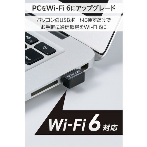 エレコム WDC-X600DU2M-B Wi-Fi 6対応 USB2.0 小型無線LANアダプター 超小型 Windows 11/10対応 発売日:2025年8月20日●パソコンに装着したままでも邪魔にならない、超小型サイズ!手軽にWi-Fi 6通信ができる11ax・USB2.0対応600Mbps小型無線LANアダプターです。●パソコンのUSBポートに装着することで、無線通信を実現するWi-Fi 6 USB2.0対応 600Mbps無線LANアダプターです。●※USB2.0規格に基づき、実際のスループットは最大480Mbpsです。●ノートパソコンに装着しても、飛び出す部分はわずか約9mmです。装着したまま持ち運んでも邪魔になりません。●ルーターから離れた場所でも集中した電波を受信できる「ビームフォーミング」機能にも対応し、快適に通信が可能です。●※ルーター側も「ビームフォーミング」に対応している必要があります。●環境にやさしいEU RoHS指令準拠。EU RoHS指令とは電気・電子機器に関する特定有害物質の使用制限についてEU(欧州連合)が決めた指令です。●自社環境認定基準を1つ以上満たし、『THINK ECOLOGY』マークを表示した製品です。●環境保全に取り組み、製品の包装容器が紙・ダンボール・ポリ袋のみで構成されている製品です。 【仕様】対応OS(Windows):Windows 11/10(Home/Pro)対応OS 備考:※メーカーのサポートが終了したOSでは、基本機能以外の動作保証やサポートに対応できない場合があります。無線規格:IEEE 802.11ax/IEEE 802.11ac/IEEE 802.11n/IEEE 802.11g/IEEE 802.11b/IEEE 802.11a無線伝送方式:IEEE 802.11ax:OFDMA、IEEE 802.11ac:OFDM、IEEE 802.11n:OFDM、IEEE 802.11g:OFDM、IEEE 802.11b:DS-SS、IEEE 802.11a:OFDM無線伝送速度(理論値):IEEE 802.11ax:最大600Mbps、IEEE 802.11ac:最大433Mbps、IEEE 802.11n:最大150Mbps、IEEE 802.11g:最大54Mbps、IEEE 802.11b:最大11Mbps、IEEE 802.11a:最大54Mbps ※USB2.0規格に基づき、実際のスループットは最大480Mbpsです。周波数帯域:2.4GHz帯:2、400〜2、484MHz、5.2GHz帯(W52):5、150〜5、250MHz、5.3GHz帯(W53):5、250〜5、350MHz、5.6GHz帯(W56):5、470〜5、730MHzチャンネル:2.4GHz帯:1〜13ch、5GHz帯(W52/W53/W56):36/40/44/48/52/56/60/64/100/104/108/112/116/120/124/128/132/136/140/144ch無線セキュリティ:WPA3 Personal(AES)/WPA2 Personal(AES)/WPA Personal(AES)/WEP(64bit/128bit)ビームフォーミング機能:対応(Rxビームフォーミングのみ)MU-MIMO機能:非対応アクセス方式:インフラストラクチャーアンテナ(本数):内蔵アンテナ送受信1本(2.4GHz/5GHz共用)送信出力:10mW/MHz以下対応USB規格:USB2.0 ※本製品はパソコン、タブレットPCのUSBポートに直接接続してください。USBハブや延長ケーブルなどに接続した場合の動作は保証対象外です。USBインターフェース:USB-AUSB伝送速度(理論値):USB2.0:480Mbps入力電圧:DC 5V消費電力:2.5W(USB2.0最大)