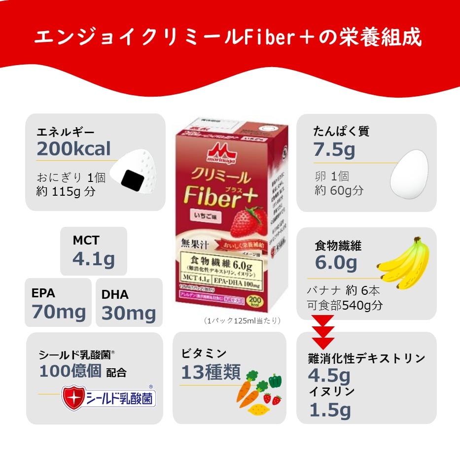 主要栄養成分(1パック125ml当り) エネルギー(kcal):200 たんぱく質(g):7.5 脂質(g):8.9 炭水化物(g):27.1 食塩相当量(g):0.28 ●難消化性デキストリン 4.5g(1パック125ml当たり) ●腸内細菌による利用性が高いイヌリンとビフィズス菌増殖因子であるラクチュロースを配合し、腸内環境に配慮 ●シールド乳酸菌?100億個配合(1パック125ml当たり)