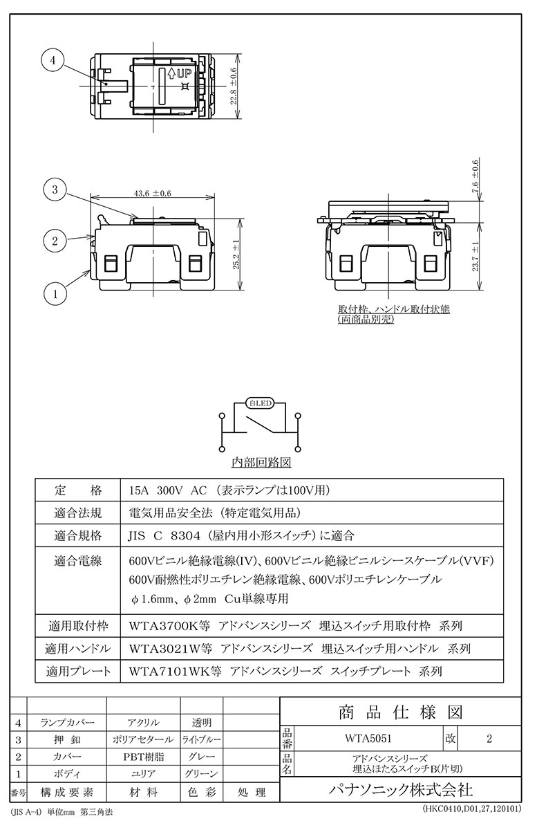 こちらの商品は外箱を開封された場合、返品交換を承ることは出来かねます。 (不良商品の場合は除く) 商品の品番・仕様等を充分にご確認頂いた上でご注文ください。 その他条件に付きましては 支払・配送方法 をご確認ください。 メーカー:Panasonic / パナソニック (旧ナショナル National 松下電工) シリーズ名:アドバンスシリーズ配線器具 定格電流:15A 定格電圧:300V (表示ランプは100V用) JISC8304(屋内用小形スイッチ類)に適合 関連キーワード スイッチ 埋め込み 壁 ADVANCEパナソニック アドバンスシリーズ配線器具 基本スイッチ ■特徴 スイッチやコンセント。当たり前に存在するものを上質にすることで、住まいは引き立ちます。 アドバンスシリーズは[デザイン・操作性・機能]にこだわった、新しい上質のカタチです。 ほたるスイッチOFFにすると、スイッチに小さな緑のランプが点灯。 あかりの消えた真っ暗な部屋でも、スイッチの位置がすぐわかります。 ひかるスイッチスイッチONの時にランプが点灯し、消し忘れを防止します(赤色)。負荷の容量に関わらず、ランプは点灯します。(1500Wまで) 容量が低すぎる人感センサー付き機器を接続する場合に便利です。結線は3線式です。 パイロットスイッチ スイッチONの時にランプが点灯し、消し忘れを防止します(赤色)。負荷容量に合ったパイロットスイッチを選ばないとランプが点灯しません。結線は2線式です。 パイロットほたるスイッチ 点灯を赤色、消灯を緑色のランプでお知らせ。暗闇でもスイッチの位置がわかります。負荷容量に合ったパイロットスイッチを選ばないとランプが点灯しません。 ≪アドバンスシリーズ ソリッドハンドル≫ ◎質感が統一されたシンプルなデザイン ハンドルとプレートの質感を統一させることで、空間との調和性をより一層高めます。 ◎汚れが取りやすい表面形状 優れたメンテナンス性はそのまま従来品のプレートと同じマット仕上げの凹凸面は汚れが取れやすく、簡単な拭き掃除で美観を保てます。 ◎サイズは変わらず施工・交換もこれまでどおり 仕様はこれまでどおり。従来品との互換性もあり、設置・取り換えもスムーズに行えます。 ※この商品は電気工事士による取付工事が必要です。資格を有しない一般消費者は、取付・取替工事を行うことは法律上できません。
