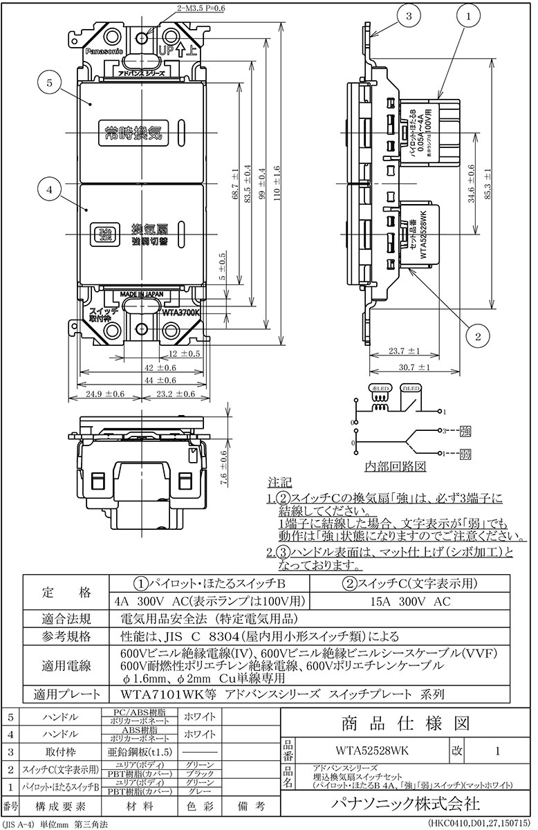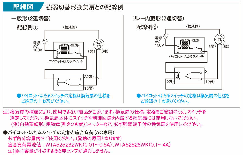 こちらの商品は外箱を開封された場合、返品交換を承ることは出来かねます。 (不良商品の場合は除く) 商品の品番・仕様等を充分にご確認頂いた上でご注文ください。 その他条件に付きましては支払・配送方法をご確認ください。 メーカー:Panasonic / パナソニック電工 (旧ナショナル National 松下電工) シリーズ名:アドバンスシリーズ配線器具 換気扇スイッチ・タイマスイッチ 定格:パイロット・ほたるスイッチB 4A 300V AC(表示ランプは100V用) スイッチC(文字表示用) 15A 300V AC 適用電線:φ1.6 φ2 Cu(銅) 単線専用 より線にはWV2500、WV2501棒型圧着端子をご使用ください。 【適合プレート(別売)】 WTA7101WK(スイッチプレート1連用)WTA8101W(セレクトスイッチプレート1連用) ※換気扇の種類により、使用できない商品がございます。換気扇の仕様、定格をご確認のうえ、スイッチを選定してください。 ※換気扇本体にスイッチや制御回路を内蔵する換気扇には使用しないでください。 (例)自動運転形、連動式(引きひも式)シャッターなど。 ※必ず強弱端子付の換気扇を使用してください。 ●パイロット・ほたるスイッチの定格と適合負荷(AC専用) 必ず負荷容量内でご使用ください。(発熱の原因となります) 適合負荷電流値 :0.01〜0.5A ※負荷容量が小さすぎると赤ランプが点灯しません。 関連キーワード スイッチ 埋め込み 壁 ADVANCE 換気扇パナソニック アドバンスシリーズ配線器具 換気扇スイッチ・タイマスイッチ ■特徴 スイッチやコンセント。当たり前に存在するものを上質にすることで、住まいは引き立ちます。 アドバンスシリーズは[デザイン・操作性・機能]にこだわった、新しい上質のカタチです。 照明と換気扇をさまざまな生活シーンにおいて快適に制御するスイッチです。 ≪アドバンスシリーズ ソリッドハンドル≫◎質感が統一されたシンプルなデザインハンドルとプレートの質感を統一させることで、空間との調和性をより一層高めます。 ◎汚れが取りやすい表面形状優れたメンテナンス性はそのまま従来品のプレートと同じマット仕上げの凹凸面は汚れが取れやすく、簡単な拭き掃除で美観を保てます。◎サイズは変わらず施工・交換もこれまでどおり仕様はこれまでどおり。従来品との互換性もあり、設置・取り換えもスムーズに行えます。 ※この商品は電気工事士による取付工事が必要です。 資格を有しない一般消費者は、取付・取替工事を行うことは法律上できません。