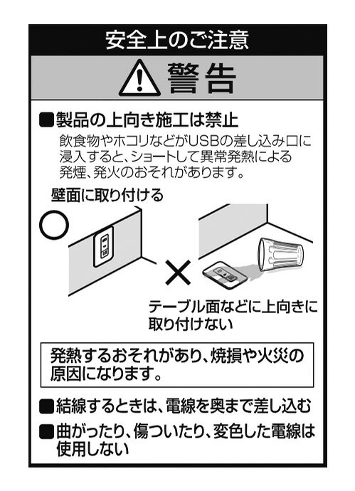 こちらの商品は外箱を開封された場合、返品交換を承ることは出来かねます。 (不良商品の場合は除く) 商品の品番・仕様等を充分にご確認頂いた上でご注文ください。 その他条件に付きましては 支払・配送方法 をご確認ください。 メーカー:Panasonic / パナソニック電工 (旧ナショナル National 松下電工) シリーズ名:埋込[充電用]USBコンセント ≪定格入力≫ 【USB】AC100V 35VA ≪定格出力≫ 【USB-A】 DC5V 3A DC9V 2A 【USB-C】 DC5V 3A DC9V 2A DC12V 1.5A 【USB-A+USB-C】 DC5V 合計3A 【扉付コンセント】 定格:15A 125V 製品の上向き施工は禁止 飲食物やホコリなどがUSBの差し込み口に侵入するとショートして異常発熱による発煙、発火の恐れがあります。 7mm以上の壁厚に取り付けてください。 電線収納を容易にするため、取付部の奥行き57mm以上を確保してください。 ボックス工事の場合、浅型スイッチボックスが使用出来ません。 壁厚9mm以上の場合、標準型スイッチボックスまたは深型スイッチボックスをご使用ください。 露出ボックスや後付ボックスは使用できません。 (取付枠の垂下部が当たり、入らない場合があります。) ボックスなし工事の場合、以下のはさみ金具をご使用ください。 WN3993、WN39929、WN3996 線間絶縁抵抗測定やブレーカのトリップテストではこの製品を外してください。 電線(電路)と大地間は取り付けたままできます。 ボックスねじは、取付枠が変形しないよう締め付けてください。 [適正締付けトルク:0.2N・m〜0.4N・m] 本製品のUSB-Cポートは最大18 WまでPD(USB Power Delivery)充電が可能です。 ケーブルや機器によってはPD充電に対応していないものがあります。 ※出力電流の合計は3Aです。2ポート同時充電は、それぞれ5V、最大1.5Aの出力になります。 使用中にポート数を1→2または2→1に変えると、出力が数秒停止することがあります。 ※接続する機器によっては、影響がある場合があります。 ※アドバンスシリーズ、SO-STYLEシリーズのコンセントプレートをご使用ください。 関連キーワード 埋め込み 壁 USB 充電 スマホ ソースタイル USB-A USBA USB-C USBCパナソニック 埋込充電用USBコンセント ■特徴 スマートフォンなどのUSB対応機器の充電が可能に。 ホテルやレストランなどにおすすめです。 スマートフォン、タブレット端末の充電用コンセントとして様々なシーンでおすすめです。 1個モジュール 出力定格1.5A〜2.4A(Type-Cは最大3A)でモジュール1個分のスペースでUSB充電が可能。 2個モジュール ・1ポート 出力定格が2Aだからタブレットも安心して充電。 ・2ポート 2台同時充電が可能です。 注)2台同時充電時の合計出力電源は合計2A〜3Aまでです。 ※この商品は電気工事士による取付工事が必要です。 資格を有しない一般消費者は、取付・取替工事を行うことは法律上できません。 特長1 電源アダプタなしで充電が可能です。 特長2 定格3Aまで対応しており、タブレット端末でも安心して充電できます。 ※1個モジュールは1.5A〜2.4Aです。(Type-Cは最大3A) 特長3 USB規格は世界共通の民間規格です。
