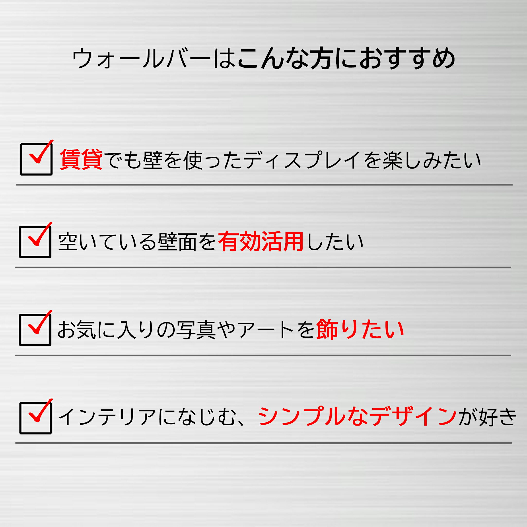 特 徴 石膏釘で簡単に取り付けられる、賃貸OKのシンプルモダンなウォールバー。壁へのダメージが少ないので気軽に取り入れられるのも魅力です。取り付け跡は小さく目立ちにくいため、模様替えやレイアウト変更も気軽に楽しめます。 玄関やリビング、デスク周りでアートや写真を飾ったり、市販のフックを使ってハンガーやバッグを掛けたりと使い方は自由自在。4サイズ展開で、サイズ違いを組み合わせて使うのもおすすめです。 さらに、同シリーズの「ウォールシェルフ」と組み合わせれば、“置く×掛ける”の見せる収納が完成します。 正面から見たときにビスが見えない美しいデザインと、圧迫感のないフォルム。どんなお部屋にも自然に溶け込みます。「壁を飾る収納」として、インテリアのアクセントにもおすすめです。 【関連商品】 ≫ウォールシェルフ 品 番 XZO001A7(W450/ブラック) XZO001W4(W450/ホワイト) XZO001Q6(W450/ホワイトシルバー) XZO002A7(W600/ブラック) XZO002W4(W600/ホワイト) XZO002Q6(W600/ホワイトシルバー) XZO003A7(W900/ブラック) XZO003W4(W900/ホワイト) XZO003Q6(W900/ホワイトシルバー) XZO004A7(W1200/ブラック) XZO004W4(W1200/ホワイト) XZO004Q6(W1200/ホワイトシルバー) サイズ W450×D41×H40(mm) W600×D41×H40(mm) W900×D41×H40(mm) W1200×D41×H40(mm) 重 量 W450:約0.5kg W600:約0.6kg W900:約0.8kg W1200:約1.2kg 耐荷重 W450:3kg W600:4kg W900:5kg W1200:6kg 素 材 アルミニウム(A6063) 仕上げ アルマイト 生産国 日本 付属品 取扱説明書、取付用ガイド、ピン止め金具、受具固定ネジ、石膏釘、本体固定ネジ 備 考 ・手をのせるなど、本体に片寄った負荷をかけないでください。 ・耐荷重を超えて物をのせないでください。 ・取り付け後は隙間やグラつきがないかを確認の上、ご使用ください。 ・定期的に状態を点検し、ゆるみなどの異常があった際は場所を変えてつけなおしてください。 注意 ・取り付けの際は、プラスドライバーをご用意ください。 ・受具を壁に固定し、本体をはめ込むだけの簡単設計です。 ・凸凹のない、平らな壁に取り付けてください。 関連ワード ウォールシェルフ ハンガー 壁掛け diy スリム 賃貸 取り付け 穴あけない シンプルモダン