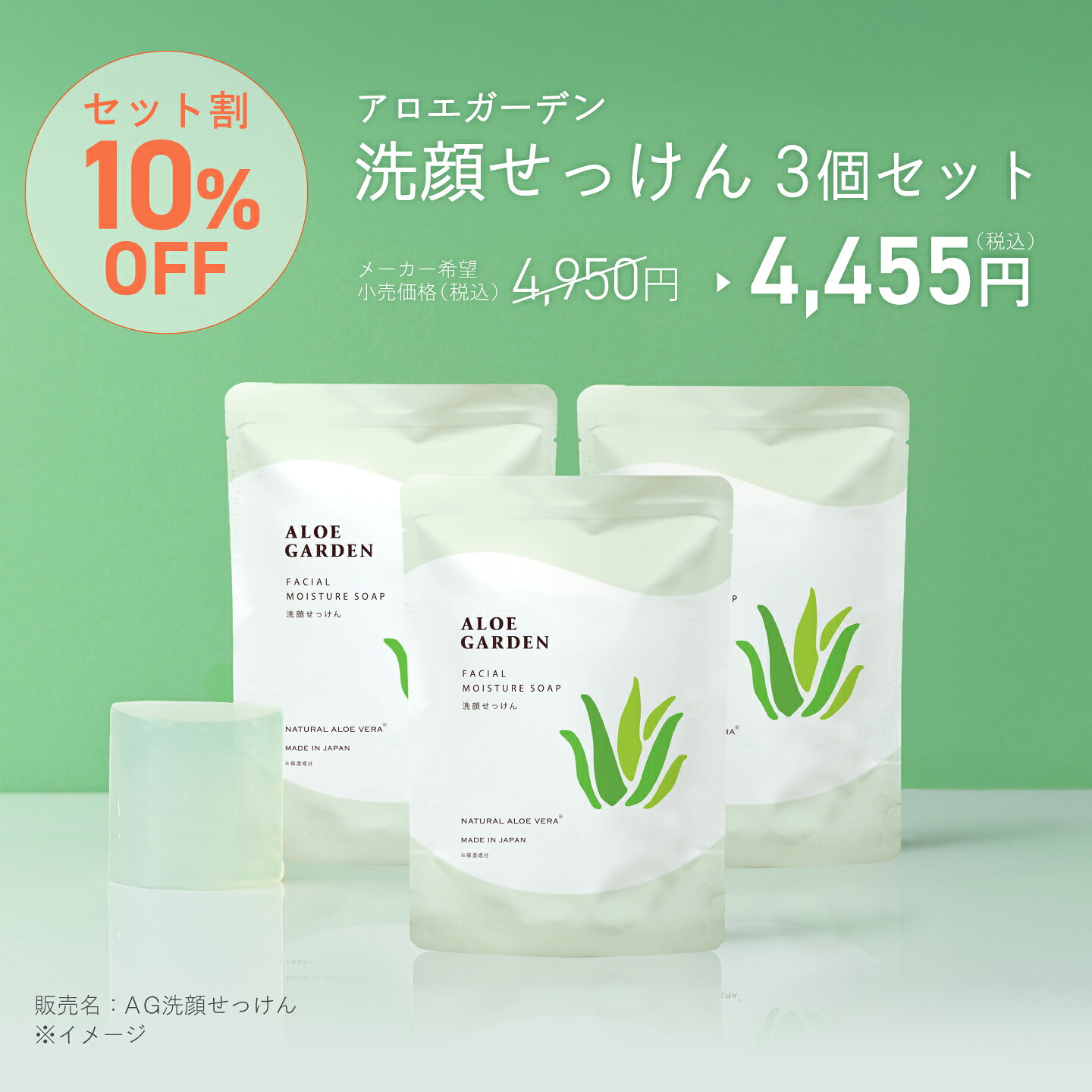 商品情報品名・販売名アロエガーデン洗顔せっけん 80 g × 3個セット【販売名】AG洗顔せっけん広告文責株式会社アロエガーデン0120-61-0022販売業者名株式会社アロエガーデン生産国日本製全成分水、グリセリン、石ケン素地、PG、ソルビトール、ラウレス硫酸Na、ラウリル硫酸Na、塩化Na、アロエベラ液汁、ハチミツ、ヨーグルト液(牛乳)、ローヤルゼリーエキス、BG、尿素、ペンチレングリコール、PEG-90M、BHT、エタノール、エチドロン酸、エチドロン酸4Na、シリカ、イミノジコハク酸4Na、クエン酸、クエン酸Na、香料商品区分化粧品ご使用上の注意●お肌に異常が生じていないかよく注意して使用してください。●お肌に合わないとき即ち次のような場合には、使用を中止してください。そのまま使用を続けますと、症状を悪化させることがありますので、皮ふ科専門医などにご相談されることをおすすめします。(1)使用中、赤み、はれ、かゆみ、刺激、色抜け(白斑など)や黒ずみなどの異常があらわれた場合。(2)使用したお肌に、直射日光があたって上記のような異常があらわれた場合。●傷やはれもの、湿疹など異常のあるところにはお使いにならないでください。●目に入らないように注意し、入った場合や異常を感じたときは、すぐに充分洗い流してください。●乳幼児の手の届かないところにおいてください。●直射日光の当たる場所、極端に高温または低温の場所には保管しないでください。注意点お使いのモニターの発色具合によって実際のものと異なる場合がございます。メーカー希望小売価格はメーカーカタログに基づいて掲載しています【60%OFF】公式【セット割】アロエガーデン 洗顔石鹸 80g 【3個セット】<小林製薬>固形 スキンケア ソープ 洗顔料 石けん せっけん ニキビ 肌荒れ を防ぐ 毛穴ケア しっとり 保湿 アロエ はちみつ ローヤルゼリー とろみ モチモチ 泡 アロエ せっけん 石けん 石鹸 ソープ 泡 植物 ボタニカル 泡立てネット ニキビ 香り 保湿成分アロエ配合のとろみ泡で 優しくお肌を包みこむ3個セット 販売名:AG洗顔せっけんうるおい成分アロエ配合のとろみ泡で優しくお肌を包みこむスキンケアソープ。3個セット。泡立てネット 付き。美容液成分(保湿成分)を約1/3配合。手作業工程を経て贅沢な製法で作りました。保湿成分ローヤルゼリーエキスやハチミツ、ヨーグルト液配合。しっとりとした洗い上がり。さわやかなアロエグリーンの香り。お肌がかさつく、お肌がくすむ(*)、ニキビができやすい、毛穴が気になるなどお悩みの方に。泡もちがよく約30秒の泡パックもオススメ。(*古い角質汚れによるくすみ)内容量:AG洗顔せっけん80g×3個------------------------------------単品購入はこちらから!アロエガーデン洗顔せっけん 1個------------------------------------ 11