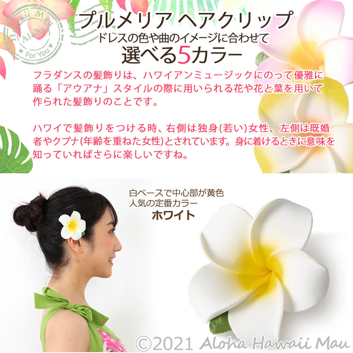 合計8個まで小型宅配便(コンパクト)での発送が可能です。 フラの教室(ハラウ)をはじめ、各種教室・サークル・グループでのまとめ買いにもご利用ください。 フラダンス 髪飾り プルメリアヘアクリップ 5カラー フラダンスのフラワーヘアクリップは、ハワイアンミュージックにのって優雅に踊るフラ「フラ・アウアナ」現代スタイルのハワイアンフラの際に用いられる花と葉を用いて作られた髪飾りで、首にかけるレイや頭につけるヘッドバンド(ポォ)と同様、フラダンス・ウクレレ・タヒチアンダンスなどのレッスン・舞台用小物として欠かせないアイテムです。 可愛らしく可憐なプルメリアはハイビスカスと並びハワイを代表する花で、ハワイのいたるところに咲き誇る花。 プルメリアのヘアクリップは、直径約7.5cmのウレタン素材で作られたポニーテールスタイルにも映え、カジュアル・お洒落に使っていただけるヘアクリップで、比較的しっかりとしたウレタン素材のプルメリア。 小さめのクリップですので、ケイキ(子供)ちゃんにもお使いいただける大きさです。 ・リゾートウェディングに参列で かわいいハワイアン 髪飾りをお探しの方 ・フラやタヒチアン・ウクレレを習っている方へのプレゼント など、500円以内で、おしゃれなプチギフトをお探しの方にもぴったりのお手頃価格、お買い求めいただきやすいプチプライスも魅力です。2つ使いも可愛い、遊び心のあるお洒落でかわいいヘアクリップです。 プルメリア ヘアクリップは、パウスカートやフラダンスやウクレレ・タヒチアンなどハワイアンドレスやムームー、浴衣、着物、タンクトップやキャミソールなど洋服やドレスの色に合わせて選べる5カラーバリエーション。 < 選べる5カラー > ○ホワイト=プルメリアの人気の定番カラー ○イエロー=明るく華やかなカラー ○ピンク=優しくキュートなカラー ○レッド=華やかで艶やかなカラー ○ブルー=甘すぎず爽やかなカラー サイズ 花:約7.5cm クリップ:約4.5cm 素材 花:ウレタン 葉:ポリエステル クリップ:スチール Made in China 可憐なプルメリアのフラワーヘアクリップは、 フラダンスやウクレレのレッスン、舞台、ハワイアンイベントはもちろん、ハワイアンドレス、ムームー、浴衣、着物などの装いのヘアアクセサリーとしてやリゾートウェディング、卒業式、お誕生日、学園祭、成人式やお祭りやおうちハワイ計画として、お部屋のインテリアに装飾ディスプレイとしても素敵です。 *プルメリア ヘアクリップはひとつひとつハンドメイド仕上げのため花や葉の付き方が異なる場合があります。また、入荷の時期によって、カラーの色合いが若干異なる場合があります。 特に複数個ご購入時、出来るだけ揃えてのお届けを心掛けますが、同じ色で揃えることが出来ない場合もあります、予めご了承願います。 プチ豆知識➀ ープルメリアー 可愛らしく可憐なプルメリアはハイビスカスと並びハワイを代表する花で、精油やハワイコスメとしても人気のある花。 ハワイ語では、「プルメリア」を「プアメリア」Pua meliaと読み、「大切な人の幸せを願う」という意味があるようです。 プルメリアの花は、「女性の守り神」として女性の魅力を引き出す力があるとされています。 プチ豆知識➁ー フラダンスでのお花の付け方ー ハワイでは既婚者の場合は左側に、未婚者は右側につけるというメッセージ的な意味があります。フラダンスの場合は統一感も大切なので、曲やドレスのイメージなど先生のお考えによって ココ 髪飾りの位置はその時々で異なることもあります。 髪飾りのつける位置は耳の後ろ、耳の真ん中を中心に上目・下目につけたり、付ける位置で印象がグッと変わりますフラダンス 髪飾りプルメリア ヘアクリップ ホワイト・イエロー・ピンク・レッド・ブルー 選べる5カラー 素材 花:ウレタン 葉:ポリエステル クリップ:スチール ハワイ規格の髪飾りは、ほつれ止め加工を施しておりませんので、花や葉にほつれなどがある場合がございます、また、ひとつひとつ手作りのため、花や葉の付き方が異なる場合や色合いが若干異なる場合がございます。 おおらかなハワイ規格のため、予めご了承願います。 〜その他のプルメリア髪飾り〜 © 2021 Waiesu Co.,Ltd. 当サイト内の画像、及び文章等の複写及び無断転載を禁じます。